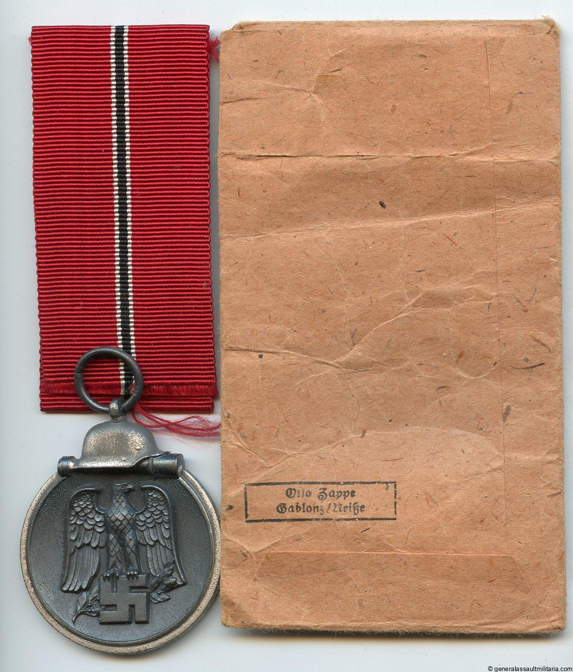 Ost medal set – MM110 Otto Zape, Gablonz. Zinc ost medal with silver, grey finish and MM110 in the ring. Remains in very good condition with some fading and comes with the matching packet marked Otto Zappe. Packet is also in good condition.