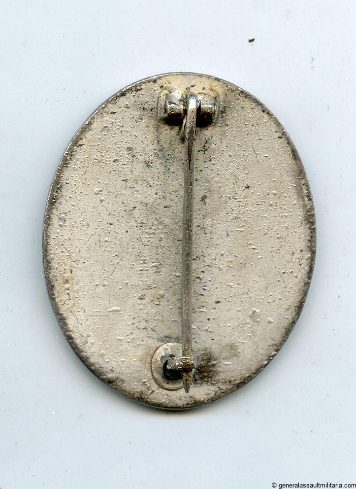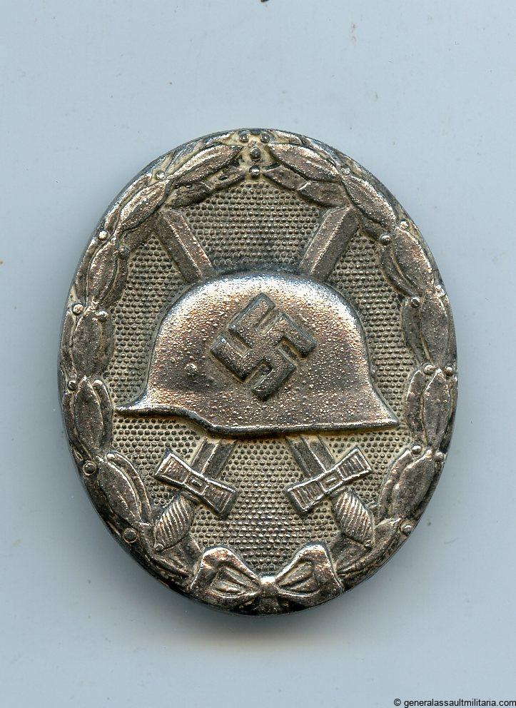 Wound badge in silver – Wächtler & Lange, Mittweida. Late war zinc wound badge with silver plated finish and crimped setup. Maker marked on the crimp with 100 for W&L. Remains in lightly worn condition and shows the finish nicely. Well preserved zinc wound badge.