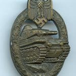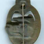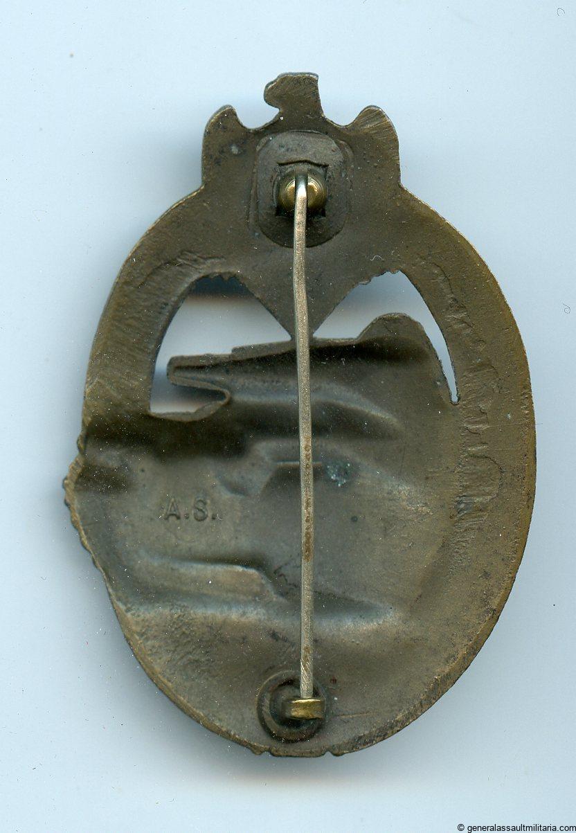 Panzer assault badge in bronze – Adolf Scholze, Gablonz. Heavy semi-hollow PAB with A.S. makers mark and dark bronze finish. Remains in mint unworn condition and retained the bronze appearance nicely. Esthetic PAB design with sharp details.