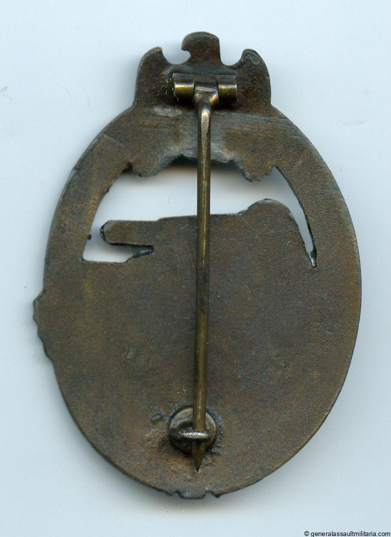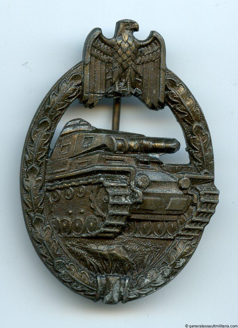 Panzer assault badge in bronze – C.E. Juncker, Berlin. Mid to late war solid zinc Juncker design with dark bronze finish. Remains in worn condition with denazified eagle, some oxidation and most of the bronze finish nicely present. Very rare to find a solid Juncker in bronze let alone with, so far unique, barrel hinge setup. One of the best designs and for the true variant collector.