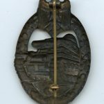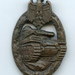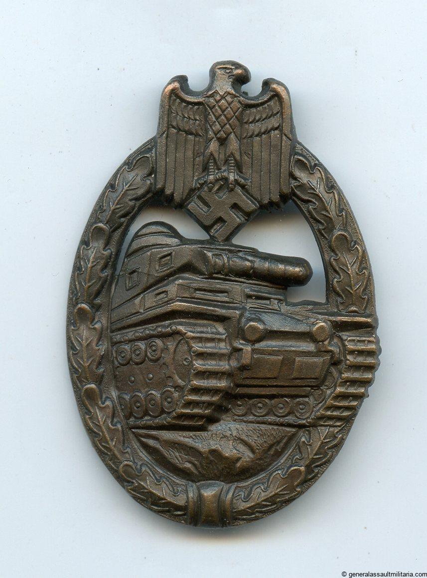 Panzer assault badge in bronze – Hymmen & Co, Lüdenscheid. Early hollow tombac badge with dark brown finish in barely worn condition. Shows the typical die flaw diagonally across the badge, indicating this was a slightly later than other that do not show the flaw as well. Stunning condition with nearly all of the chocolate brown finish still present.