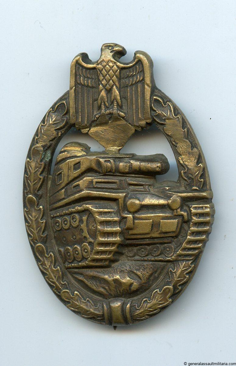 Panzer assault badge in bronze – Hymmen & Co, Lüdenscheid. Early hollow bronze PAB with Hymmen design and dark bronze finish. Remains in worn condition and was denazified at some point. Uncommon and very sought after early PAB that remains a collectible object even in damaged condition.