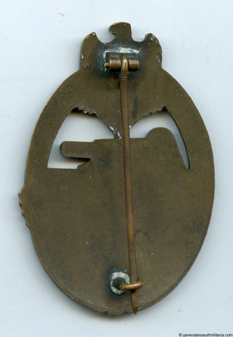 Panzer assault badge in bronze – Karl Wurster, Markneukirchen. Early to mid war solid tombac PAB with Type 1 Wurster design and small w mark on the back of the wing. Remains in worn condition with most of the thin chocolate bronze finish still present. Shows some age and white residue but has not oxidized. Good looking example of the sought after only solid tombac PAB.