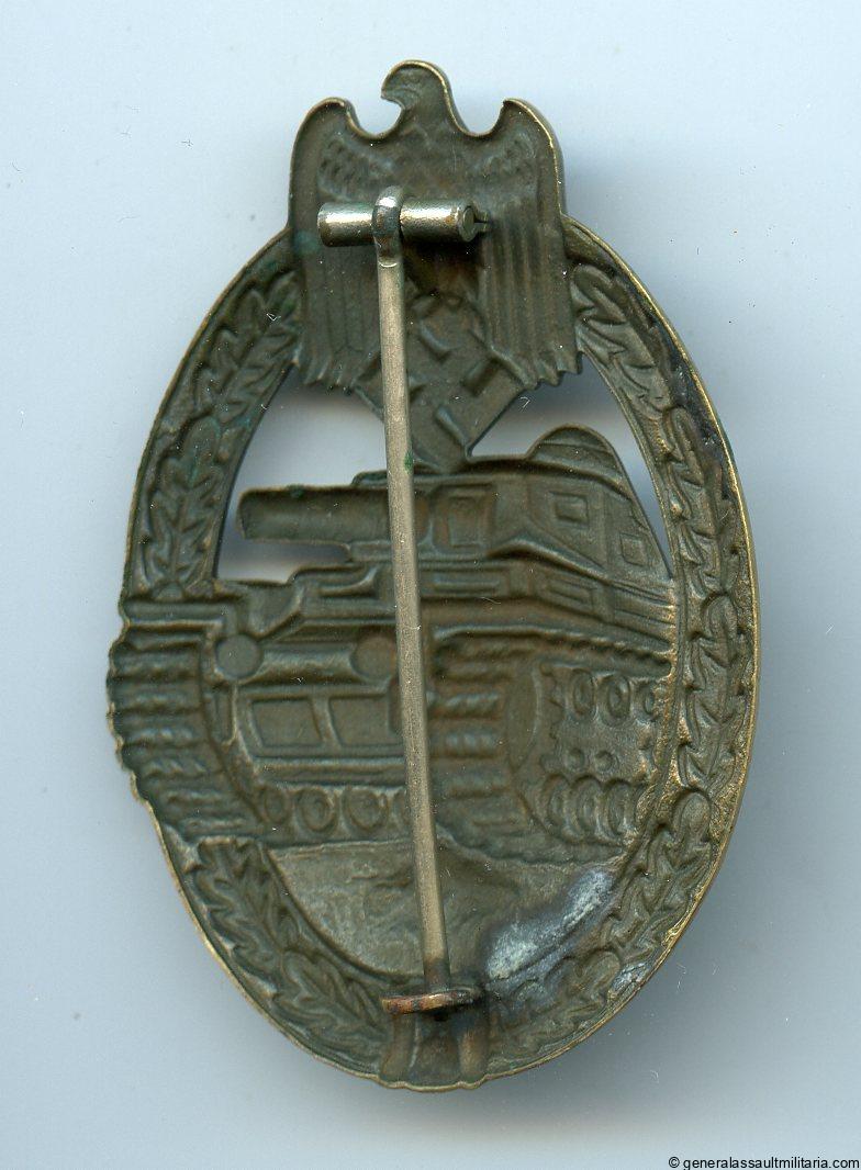 Panzer assault badge in bronze – Otto Schickle, Pforzheim. Early hollow tombac Schickle design PAB with their later machine milled C-shaped catch. Remains in lightly worn condition with nearly all bronze/green finish remaining. Shows great contrast with the tombac base material and dark finish. Top early war badge awarded to ‘panzer grenadiers’.
