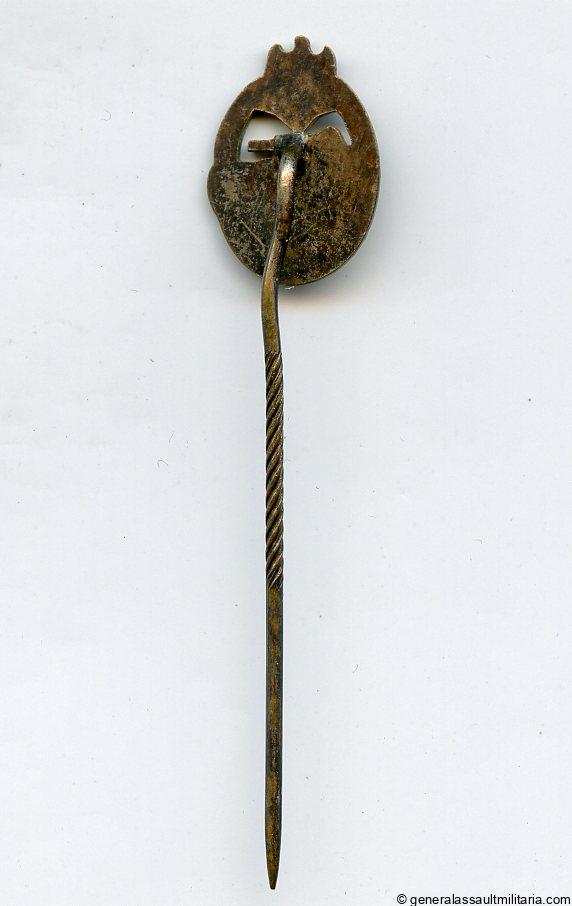 Panzer assault badge in bronze stickpin – Schickle design. Tombac stickpin with bronze finish and directly soldered pin, excellent condition. 16mm