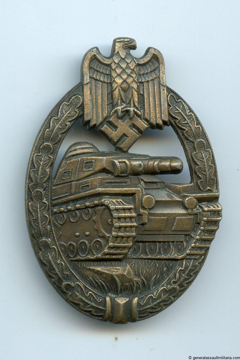 Panzer assault badge in bronze – Wilhelm Deumer, Lüdenscheid. Mid to late war zinc oval crimp setup variant with bronze finish. Remains in worn condition and shows some of the base material exposed, but with nearly all finish remaining. Very appealing and unique design.