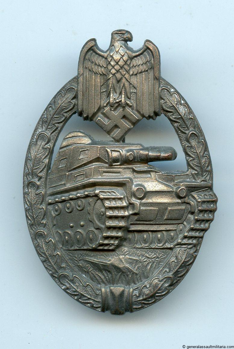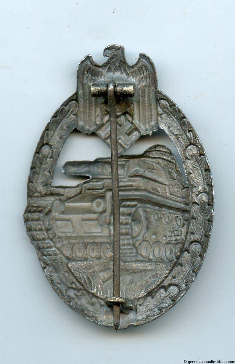 Panzer assault badge in silver – Assmann & Söhne, Lüdenscheid. Mid war cupal construction badge with Assmann design and slightly faded finish. Remains in lightly worn to unworn condition. Nicely preserved badge with a sharp design.