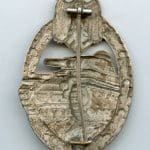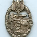 Panzer assault badge in silver – C.E. Juncker, Berlin. Early hollow nickel silver Juncker design PAB with triangle cut hinge(earliest type). Remains in worn condition with a very clean and unpatinated look to it. Uncommon early version that is among the most sought after PAB due to its high quality and esthetics design. This example was brought home by a veteran along with some more items. Premium example!