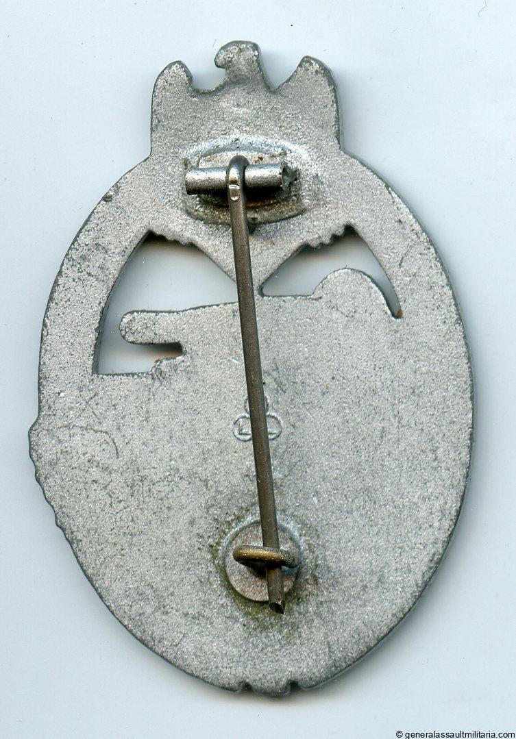 Panzer assault badge in silver – Friedrich Linden, Lüdenscheid. Mid to late war solid zinc PAB with FLL 43 makers mark. Soldered on setup with large base plate for the catch and sheet hinge. Remains in lightly worn condition with most of the finish still present. Typical Lüdenscheid design with sharp details. Well made badge of thick quality.