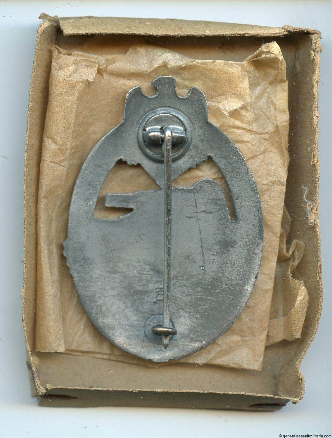 Panzer assault badge in silver – Hermann Aurich, Dresden. Late war solid zinc ‘Panzerkampfabzeichen’ with Aurich makers mark and crimped in setup. Glanzverzinkt finish remains in excellent near mint condition, with no wear. Comes from the Aurich hoard and has the original packing paper and top half of the box still present. Beautiful example.