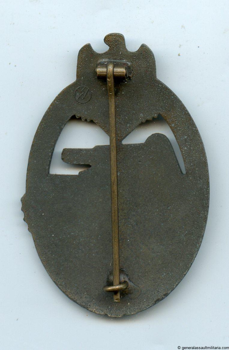 Panzer assault badge in silver – K. Wurster, Markneukirchen. Mid to late war KWM marked zinc PAB with bronze ‘Brennlack’ finish. Remains in lightly worn to unworn condition and shows part of the bronze finish faded. Quality heavy Wurster product with directly soldered setup still nicely finished.