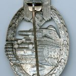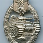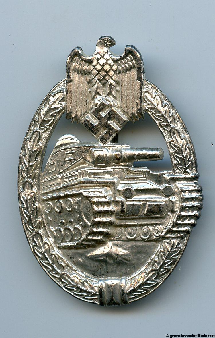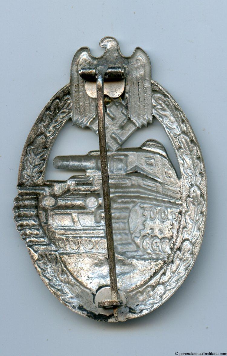 Panzer assault badge in silver – Petz Lorenz, Unterreichenbach. Early hollow tombac production with P&L Lilypad hinge. Remains in only lightly worn condition and has nearly all the bright silver finish present. Extremely well preserved P&L that rarely comes up for sale. Very uncommon early panzer badge by a maker that produced some quality awards.
