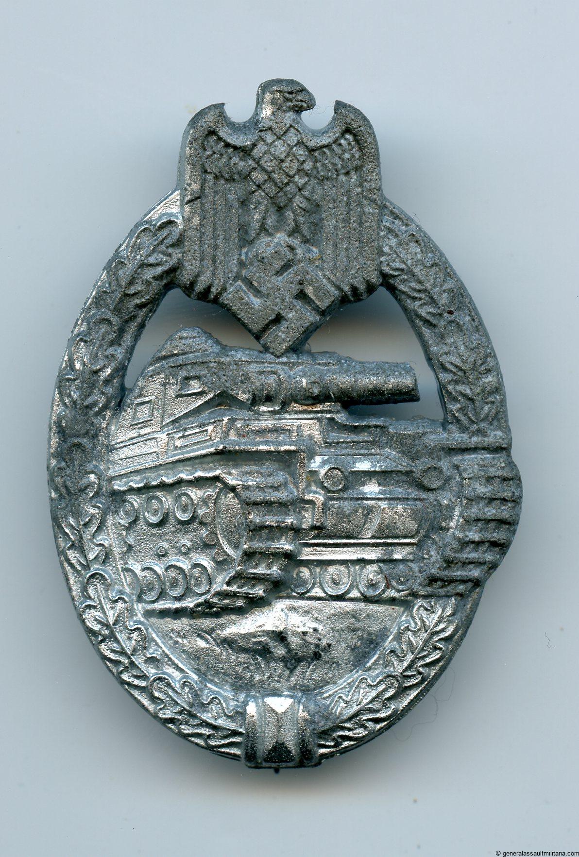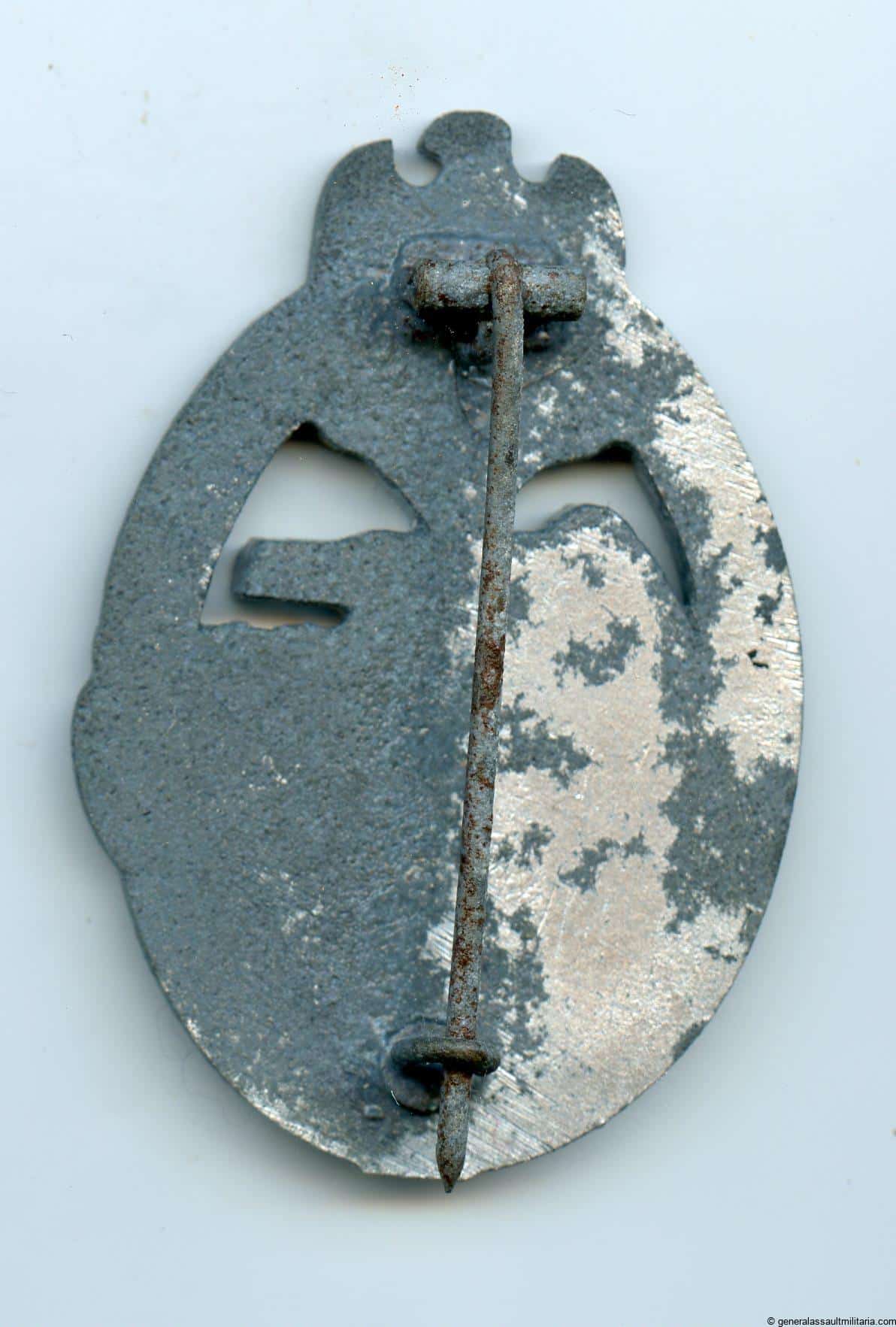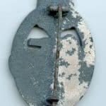 Panzer assault badge in silver – ‘Rocky’ design. Heavy zinc PAB with Vienna design and galvanized finish. Remains in oxidized and probably cleaned condition with pitted surface and zinc appearance to the parts that lost the finish. Fairly salty badge with an interesting look to it.