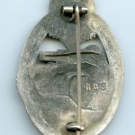 Panzer assault badge in silver – Rudolf Richter Schlag. Mid to late war semi-hollow zinc PAB with silver wash finish. Very well preserved badge in only lightly worn condition and most of the silver wash finish remaining on the front. With crimped hinge, soldered catch and R.R.S. makers mark on the back. More uncommon PAB with very well preserved silver wash finish.