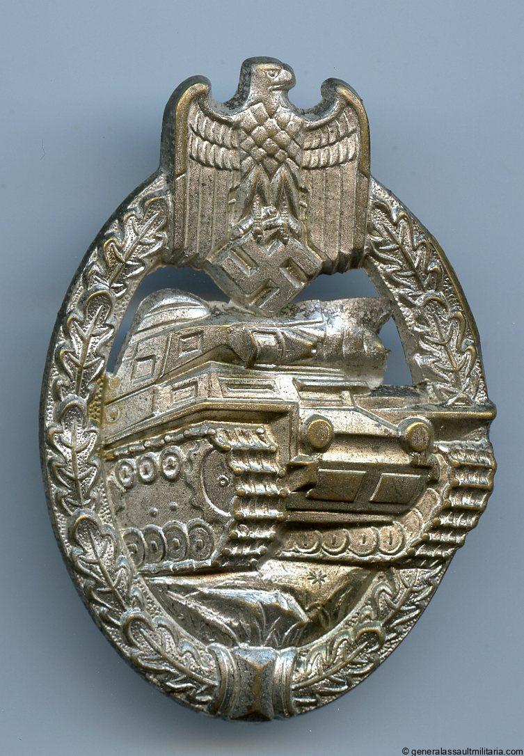 Panzer assault badge in silver – Schauerte & Höhfeld, Lüdenscheid. Early war hollow tombac ‘Panzerkampfabzeichen’ with S&H design. Remains in lightly worn condition with most of the bright silver finish still present. Has an interesting production flaw near the barrel, making it larger than normal. Very well preserved early PAB with an interesting feature.