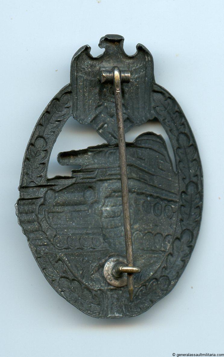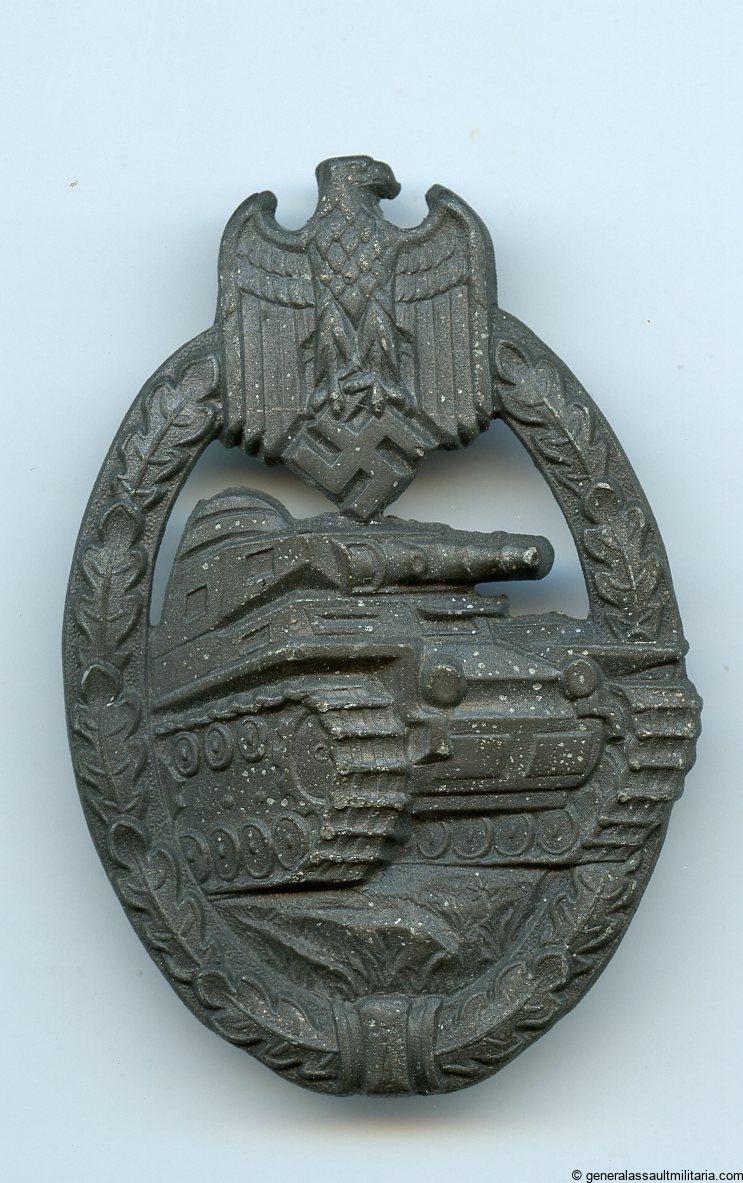 Panzer assault badge in silver – Wilhelm Deumer, Lüdenscheid. Hollow zink variant with directly soldered set up. Unmarked which is typical of mid/late war Deumer assault badges. Slightly worn condition with faded finish. Textbook hollow deumer variant with directly soldered setup.