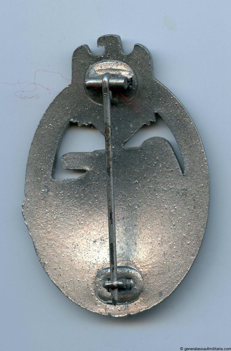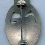 Panzer assault badge in silver – Wilhelm Deumer, Lüdenscheid. Mid to late war solid zinc PAB with ‘Oval crimp’ setup and Deumer design. Remains in unworn condition and shows a slightly curved shaped as is normally the case for this design. Some light surface oxidation in some of the lower areas on the front, but retained nearly all the finish. One of the best looking PAB designs.