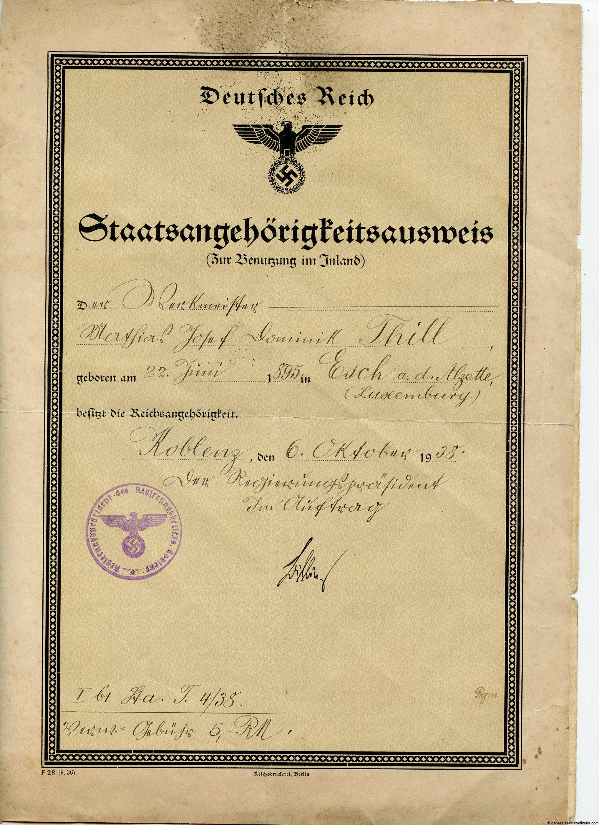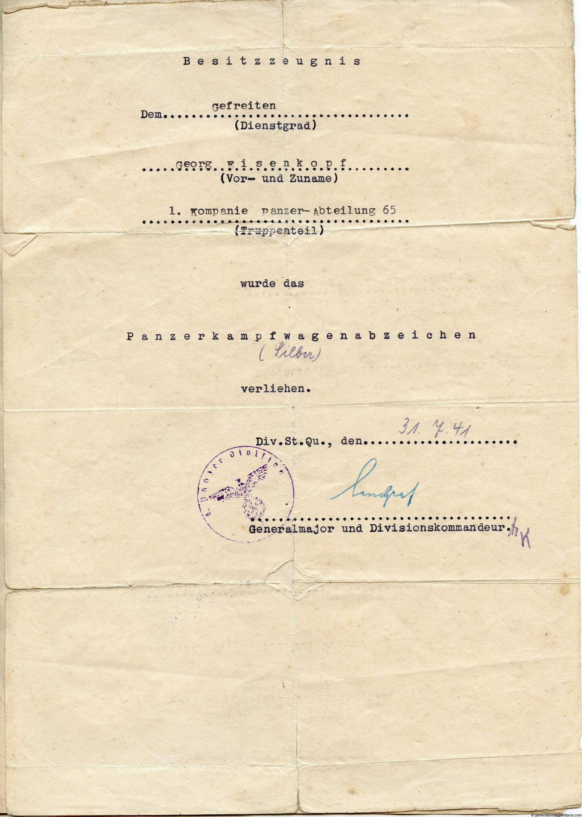 Panzer assault in silver award document panzer abteilung 65. Panzerkampfwagen in silber document to Georg Eisenkopf. Field made document singed by the Generalmajor Landgraf of the 6th panzer division. Has heavy wear on vault lines. This unit only excited for a short period and later went into panzer regiment 11. Has one additional civilian document present.