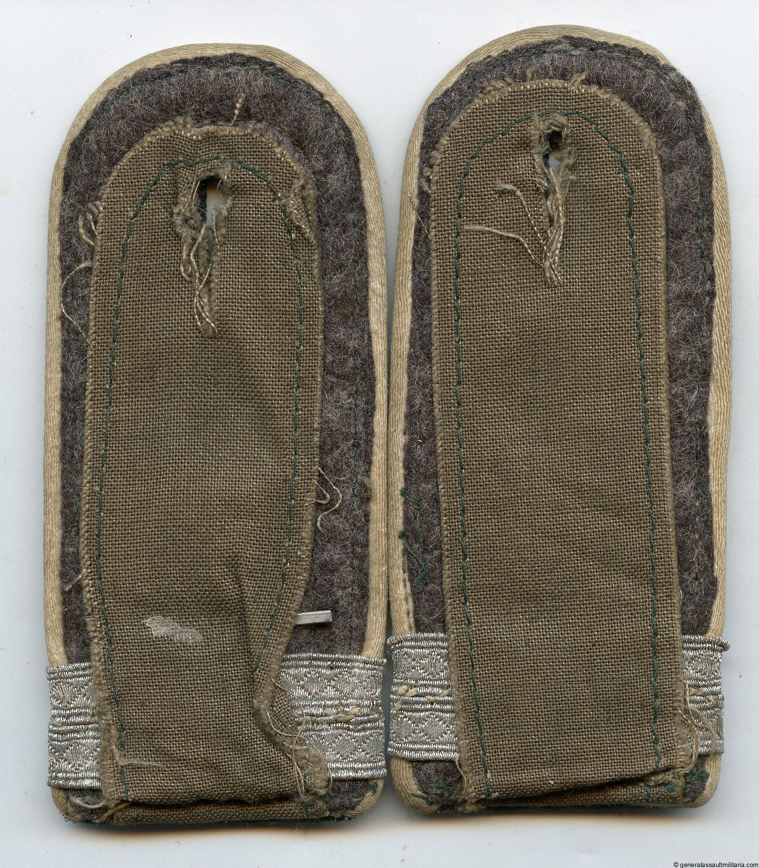 Panzer-Grenadier-Division Feldherrnhalle Shoulder straps. Matching pair of M40 Feldwebel shoulder straps with officer candidate ‘Litzen’ and zinc construction Feldherrnhalle attachment with silver finish and tombac prongs. Show untypical strap material for attachment, added later on on time. Show proper wear around the button hole to the dark green wool and silk piping is dirty from wear. The aluminum pips show good wear and match the condition of the boards. Very good looking pair of infantry Feldwebel shoulder boards for a famous unit.