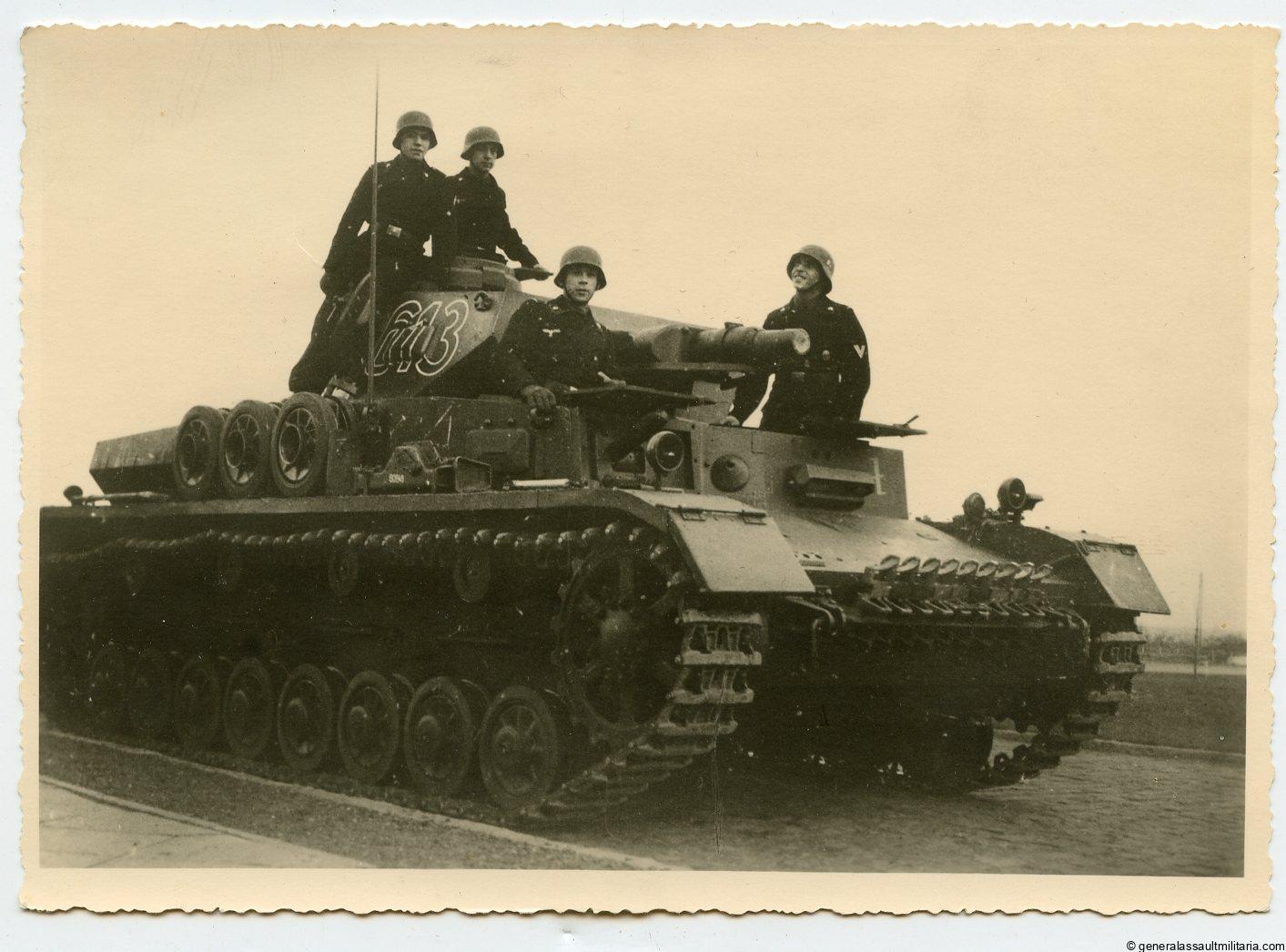 Panzer IV Ausf. D portrait – 17.5×12.5cm. Very good large size photo of a Pz IV Ausf D with the crew in black panzer jackets and with helmets in wear. Good looking pre war and very uncommon early tank produced in low numbers. Atelier stamp on the back and on unmarked period photo paper. Excellent condition.
