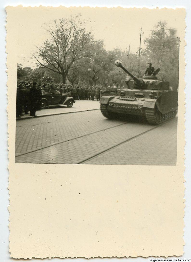 Panzer IV H with a soldier in black wrap sticking out form the turret. Small 6×9 cm private picture with a 6×6 picture developed onto it. Good quality and fairly sharp shot with a good front angle of the Tank. Uncommon and sought after Pz IV shot. Develop on double underlined Agfa-Lupex paper.