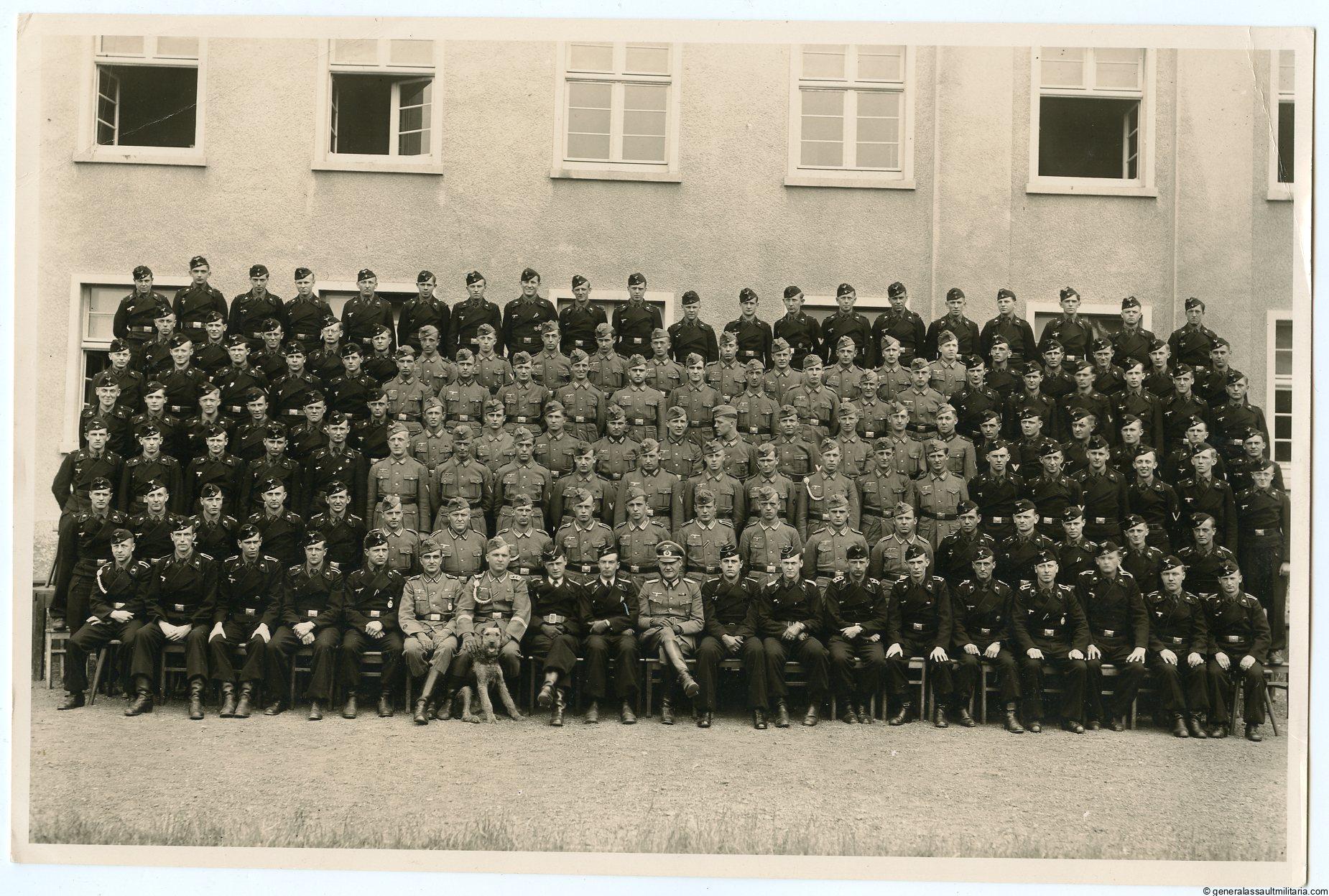 Panzer Kompanie photo – 16x23cm. Large size group photo with panzer soldier in black wrapper, including some early piped uniforms and a few soldier wearing early panzer badges and wound badges. Very sharp photo on unmarked photo paper and Paderborn Atelier stamp on the reverse. Top shot!