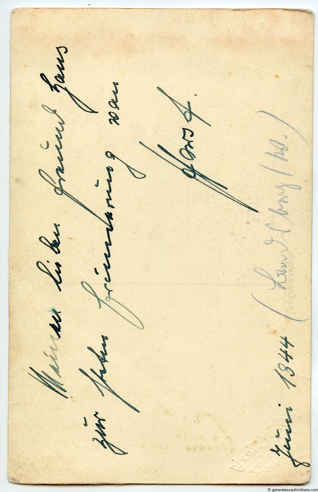 Panzer portrait with M43 wrapper in wear. Remains in very good condition and was produced on Voightländer portrait paper. Text on the back and taken in Juni 1944 by Karl Ausig Landsberg.