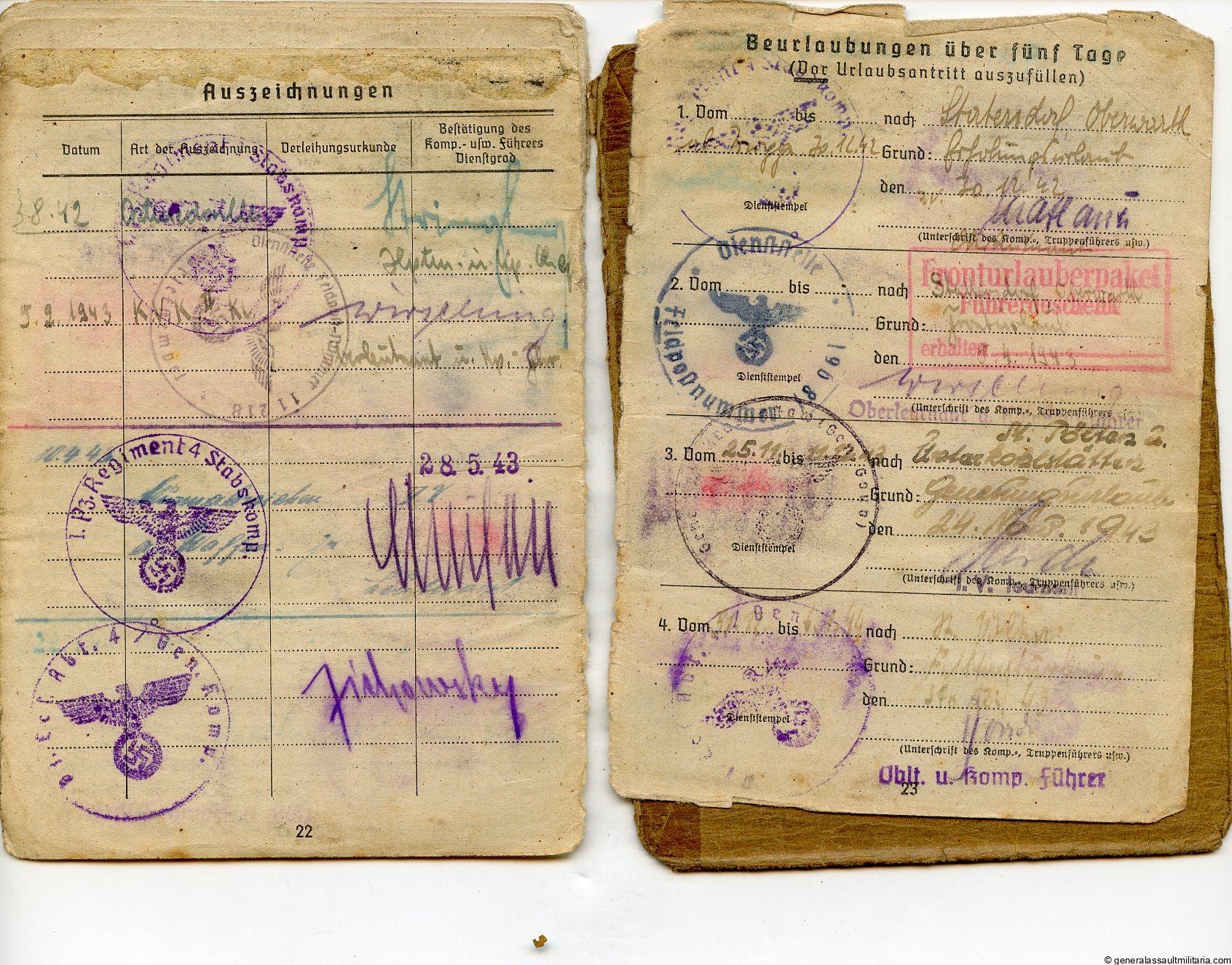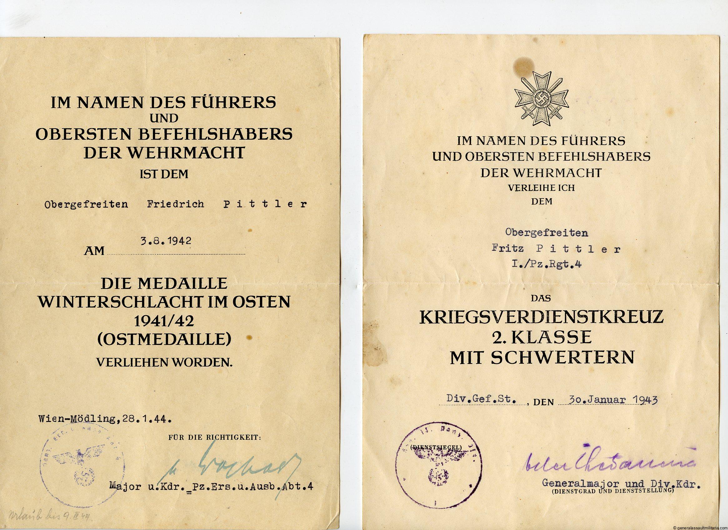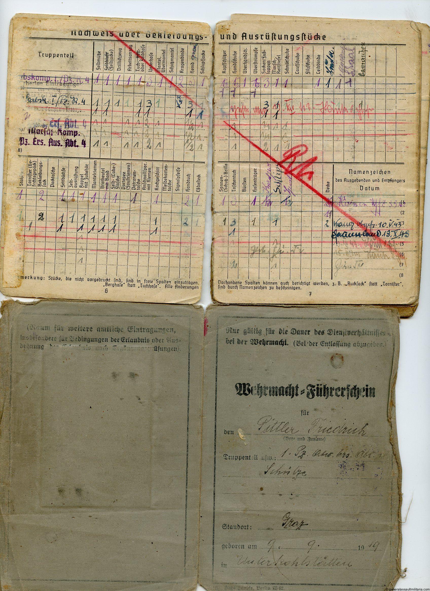 Panzer Regiment 4 + Feldherrnhalle grouping. General assault badge, Ost medal, Wound badge in black and war merit cross 2nd class award document, drivers license and Soldbuch with pages 2-4 missing. Interesting grouping too Friedrich Pittler who served with Panzer regiment 4 and Late in the war with Feldherrnhalle. Soldbuch is nicely filled in with lots of information. Sadly the first 4 pages of the Soldbuch are missing. Interesting and sought after unit.