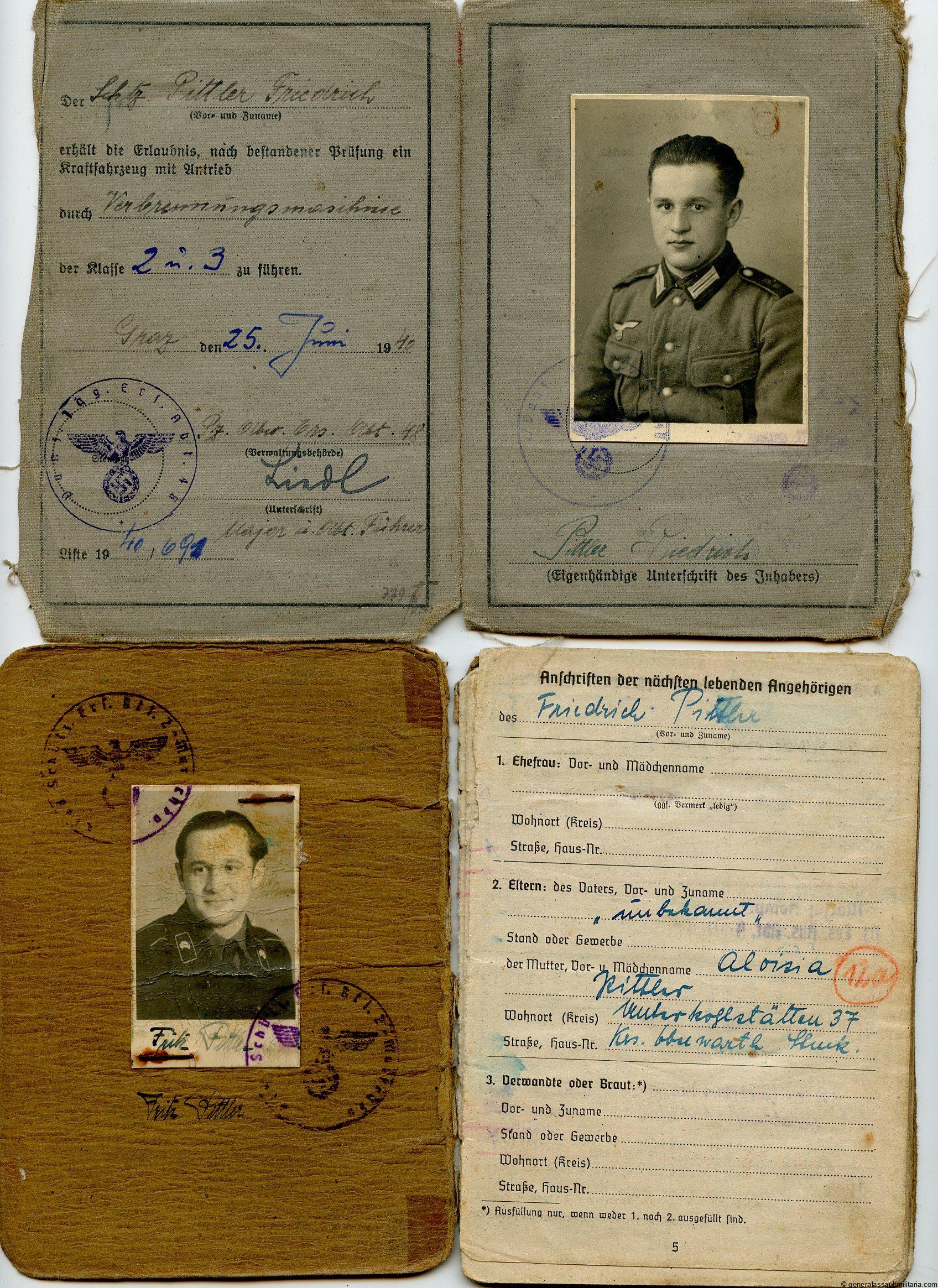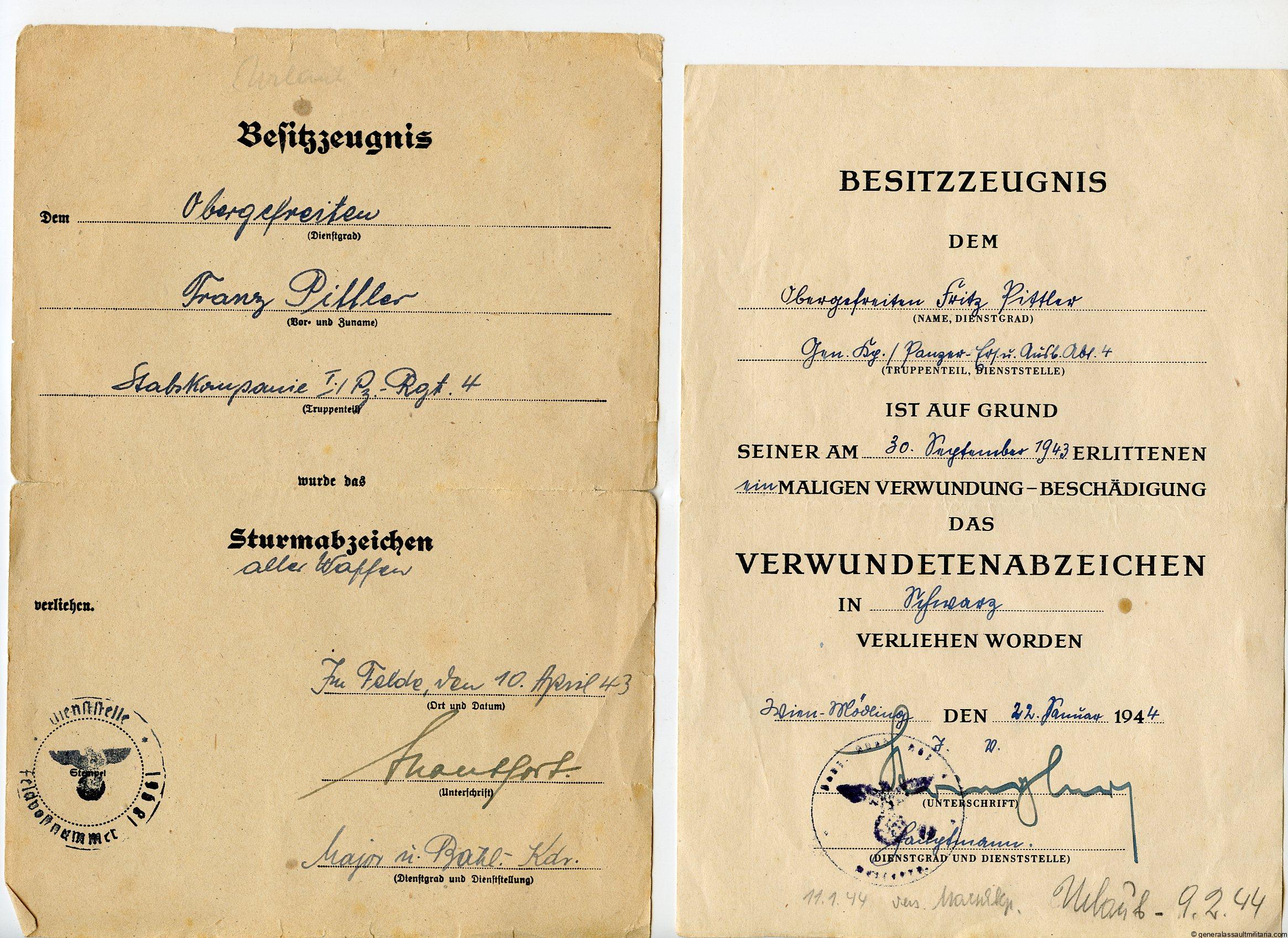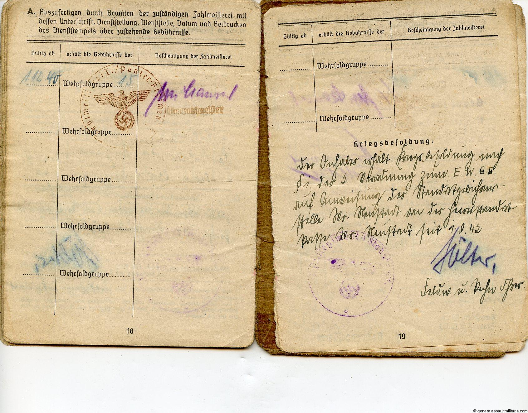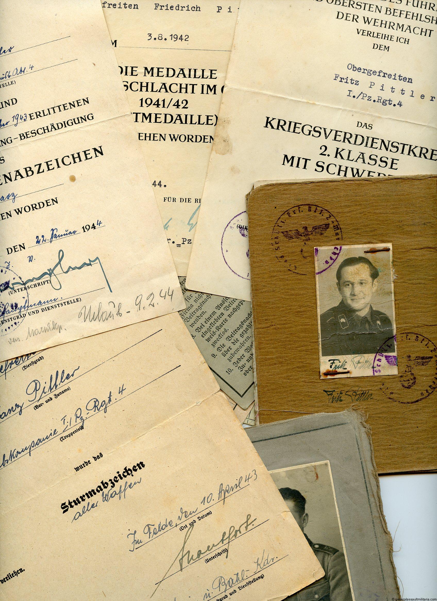 Panzer Regiment 4 + Feldherrnhalle grouping. General assault badge, Ost medal, Wound badge in black and war merit cross 2nd class award document, drivers license and Soldbuch with pages 2-4 missing. Interesting grouping too Friedrich Pittler who served with Panzer regiment 4 and Late in the war with Feldherrnhalle. Soldbuch is nicely filled in with lots of information. Sadly the first 4 pages of the Soldbuch are missing. Interesting and sought after unit.