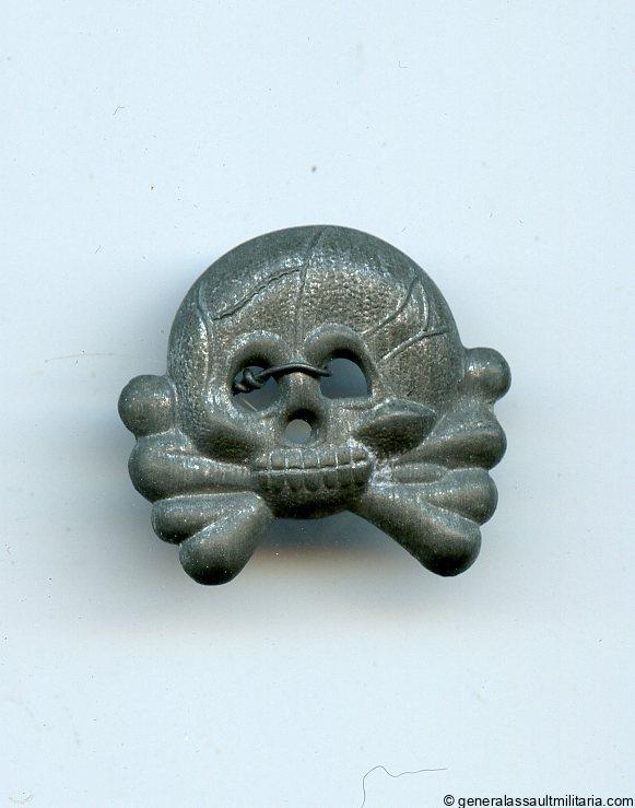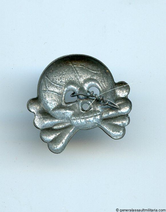 Panzer skull. Zinc construction skull with ‘Glanzverzinkt’ finish. Remains in worn condition with partially faded finish. Interestingly this example never had any prongs applied and instead shows a piece of metal wire around the nose.