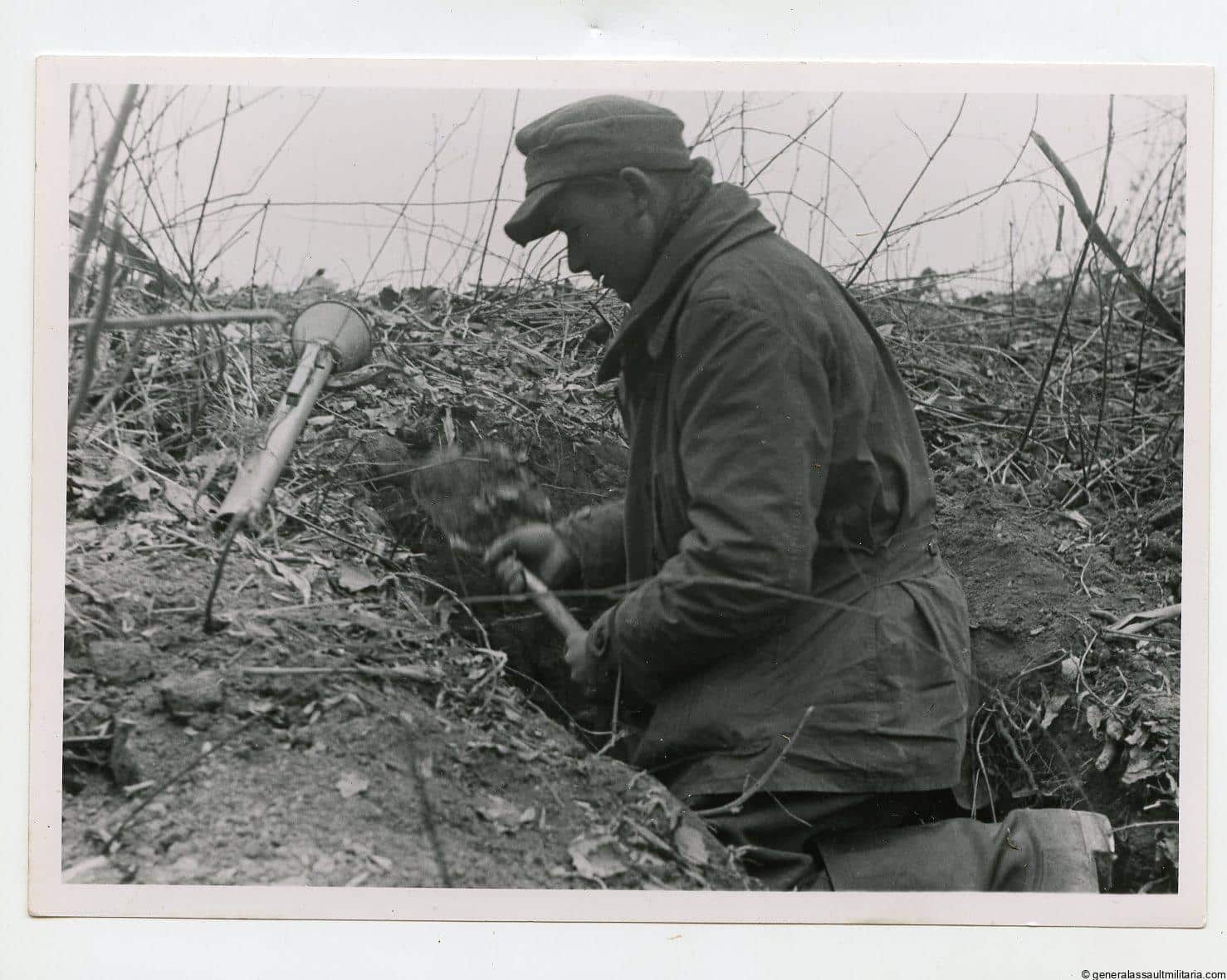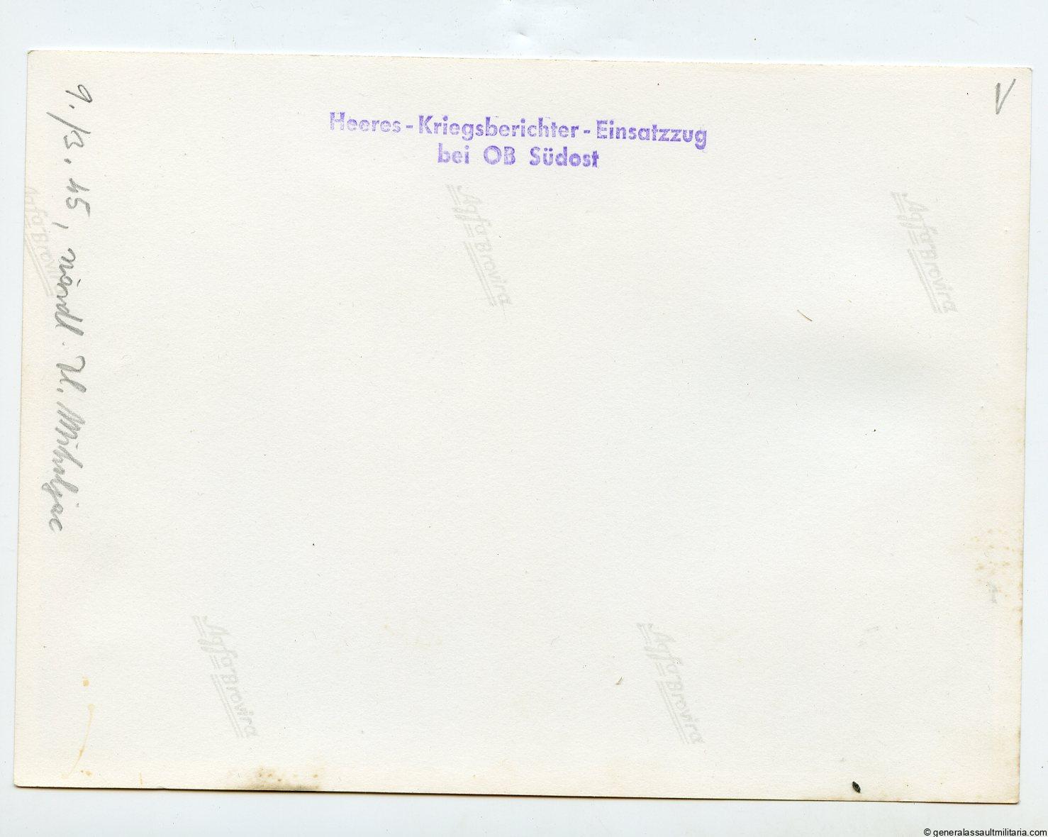Press photo 9.3.45 with a young soldier digging a fox hohl to fire the panzerfaust from. Remains in near mint condition, with Wehrmacht stamp on the resverse and produced on Agfa portrait paper. Uncommon late war pressphoto.