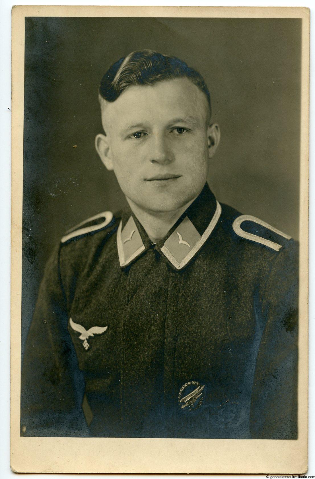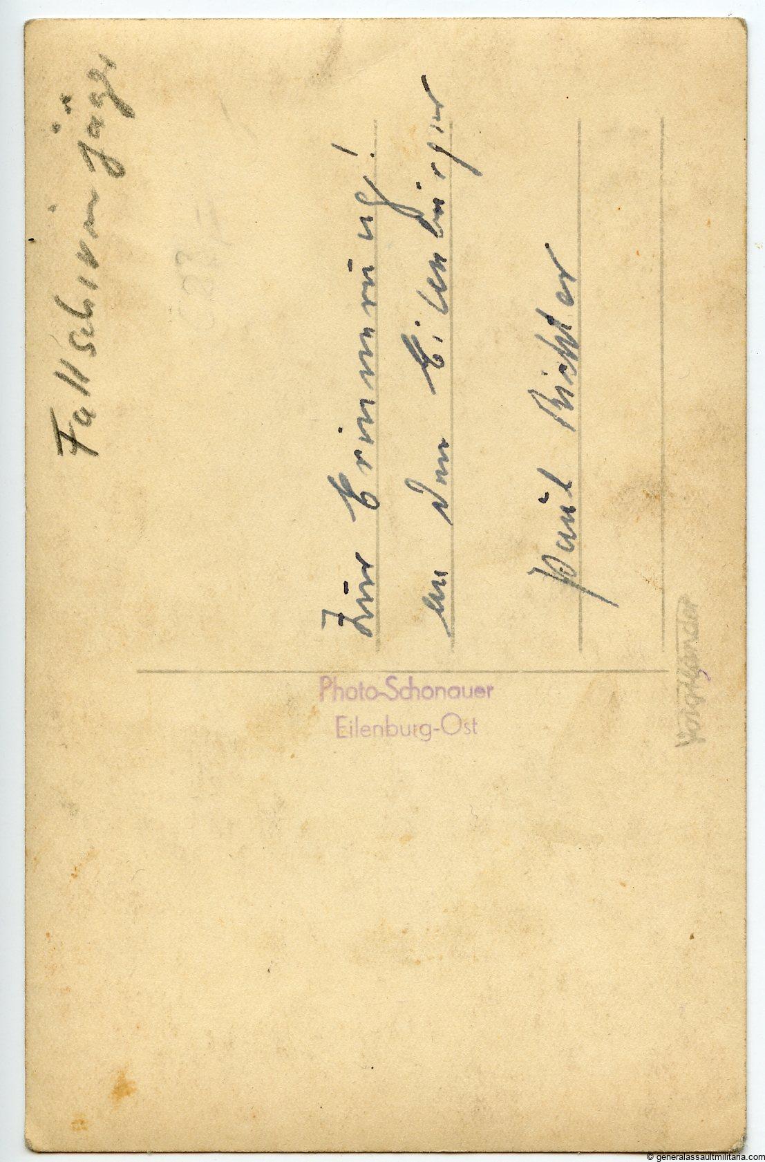 Postcard size portrait of a fallschirmjäger wearing the patratrooper badge. Lightly decolored but overall good condition. Produced by a photo atelier in Eilenburg-Ost Voigtländer postcard paper. Named Richter on the back.