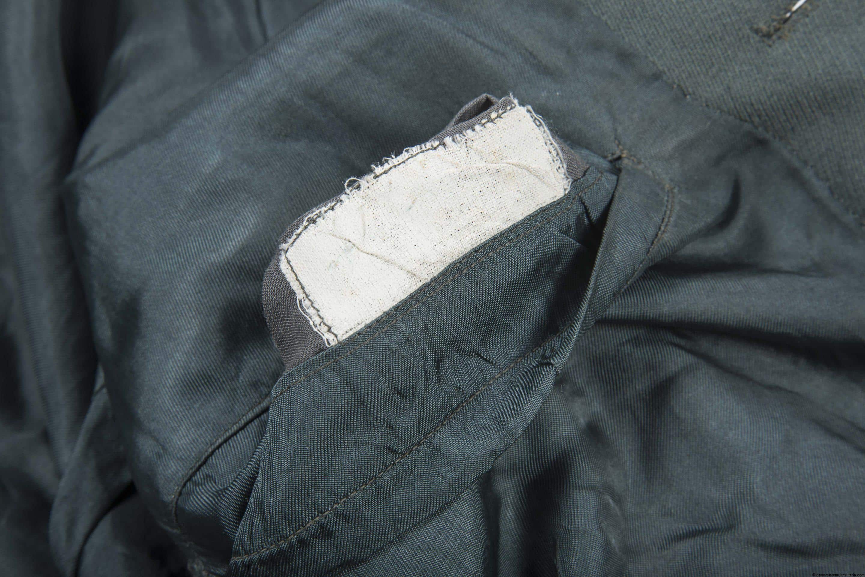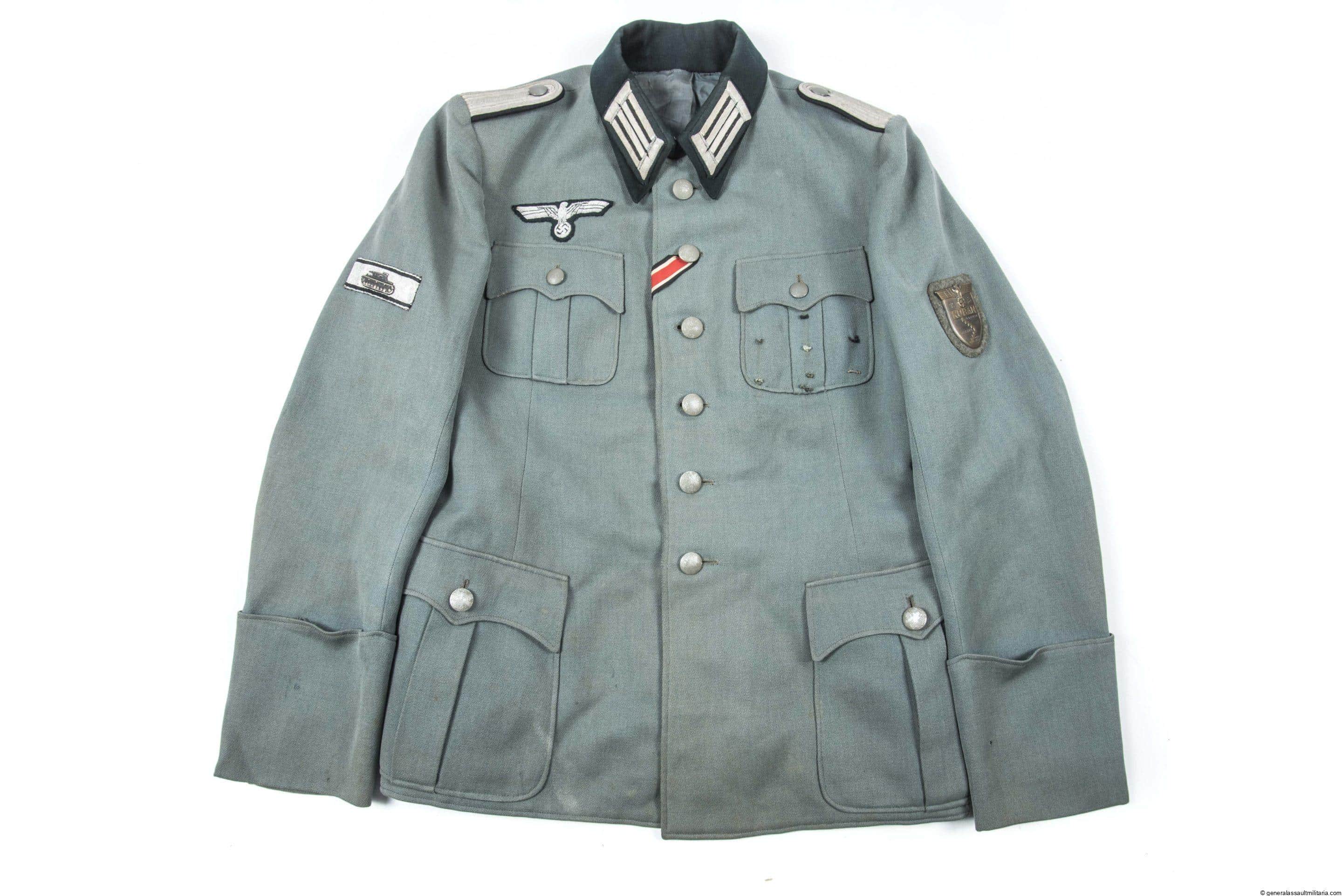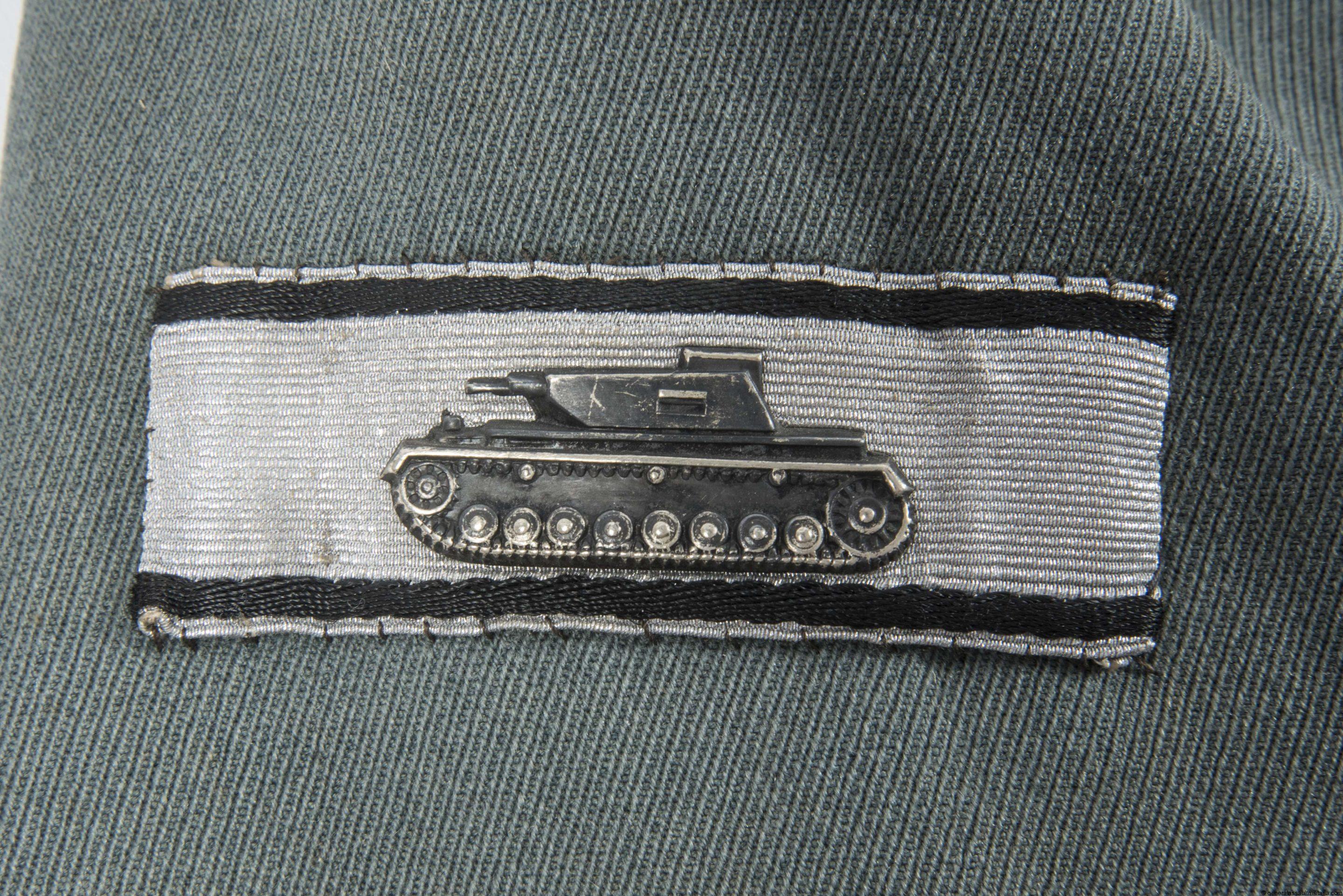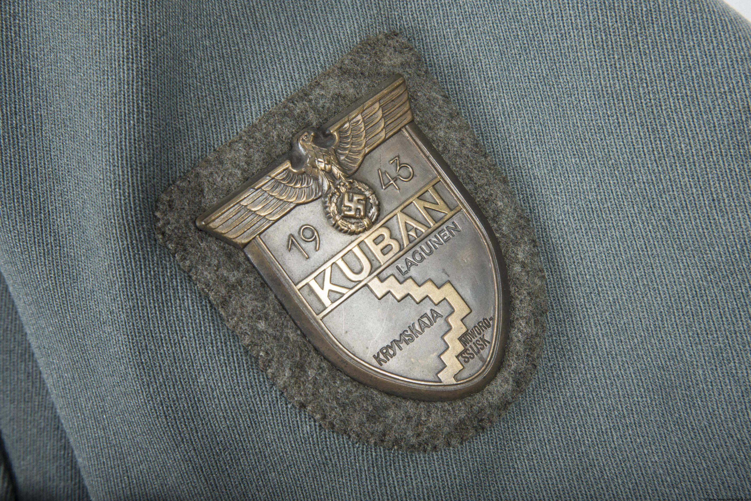 M36 style private tailored Pionier Leutnant officer jacket with tank destruction badge and Kuban shield. Garbadine cloth officer jacket with hand sewn bullion officers eagle, lightly worn Kuban shield and rare early nickel silver “Panzervernichtungsabzeichen” that remains in nicely worn condition. Shows 4 sets of loops with the top loops showing streaching from wear. All green finished aluminum buttons are present and show matching wear. Black piped Pionier tabs and boards are nicely sewn in and remain in good worn condition. Shows a name tag on the inside, but remains in extremely difficult to read condition and has nearly completely faded. Very rare TDA uniform from a highly decorated Pionier Leutnant.