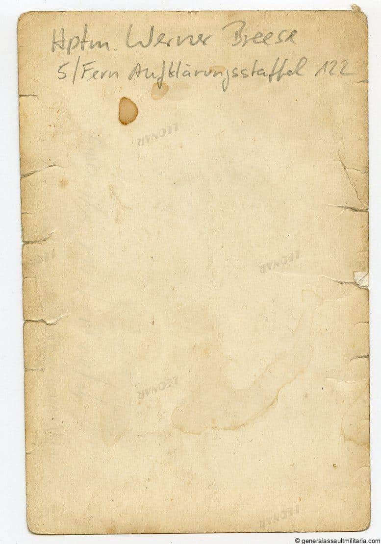 Portrait Werner Breese Aufklärungsstaffel 122. Interesting late war portrait, postcard size, Leonar photo paper. Shows so wear and damage to the edges with some light staining. Well decorated Recon pilot that had the PO, DKIG, Recon clasp with hanger and was awarded the KC on 29.02.1944.