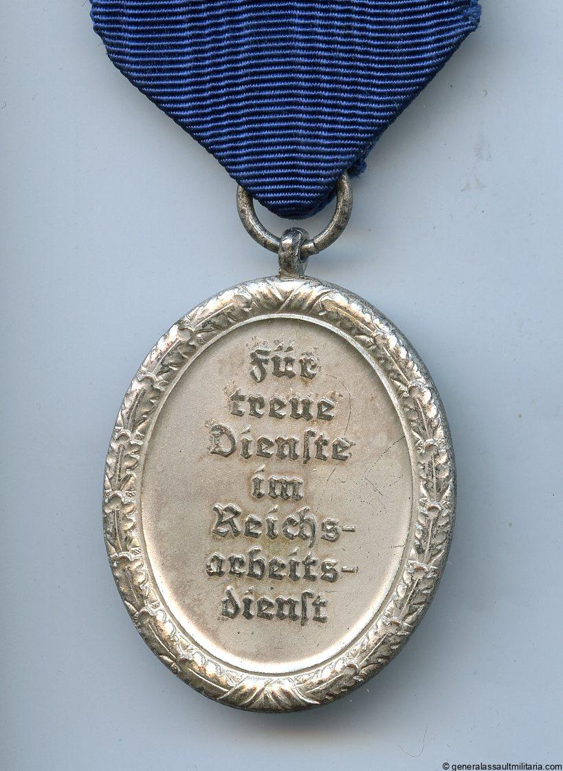 RAD 12 year service medal for men. Cupal construction with silver frosted surface and blue ribbon. Remains in very good condition with light wear.