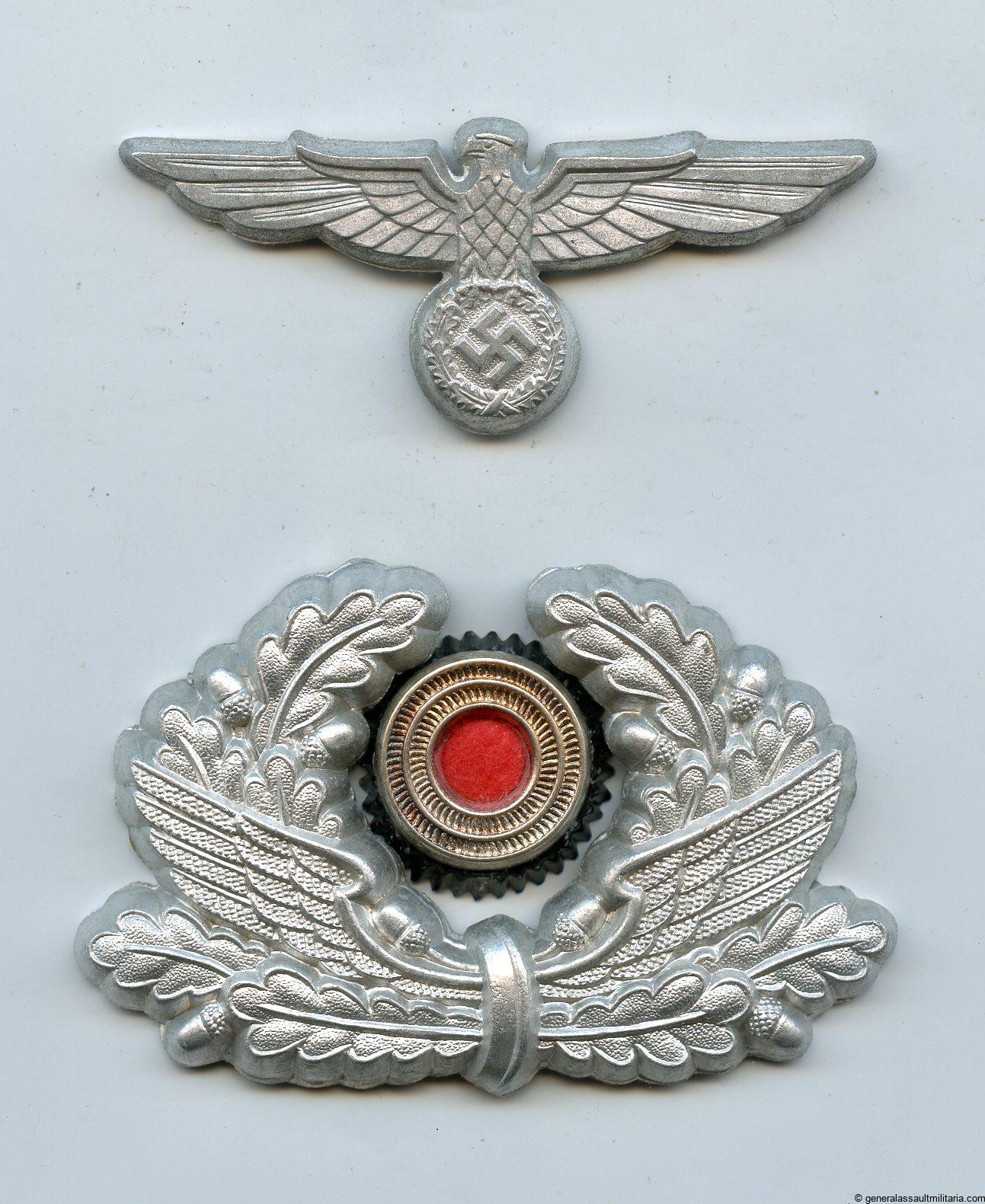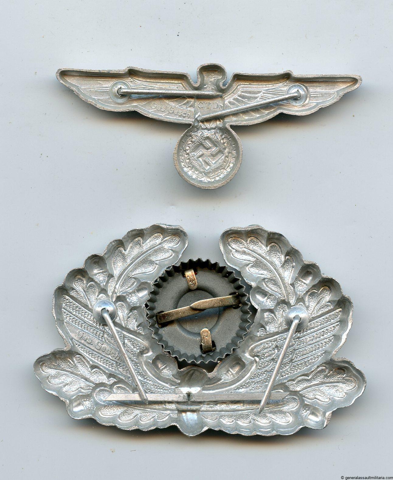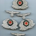 Rail road protection cap insignia set – C.T.D Lüdenscheid. Aluminum cap ‘Bahnschutz’ insignia set with crimped in aluminum prongs and Ges. Gesch. C.T.D. makers mark on the back. Remain in unworn condition and are were never applied to a cap before.