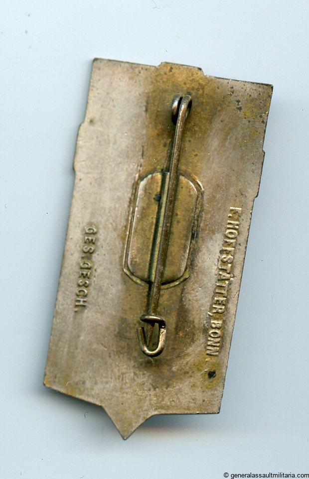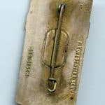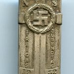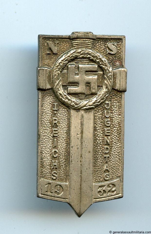 Reichs Jugendtag 1932 Postdam badge. Heavy example with bronze or silver finish on top, appears to have had both finishes with most of the bronze top layer missing. Remains in well worn condition. Maker marked Ges Gesch F. Hoffstätter, Bonn on the reverse. Setup is still nicely soldered into a the recessed area.