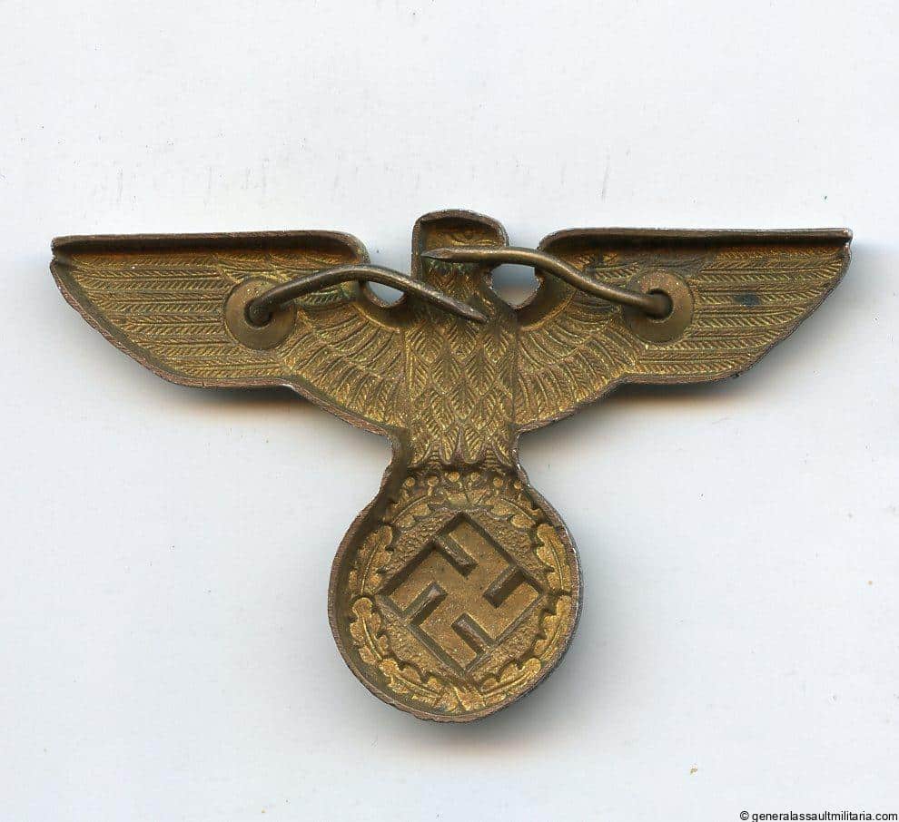 Reichsbahn cap eagle. Cupal construction with crimped in tombac prongs and gold finish. Remains in excellent condition with minimal wear.