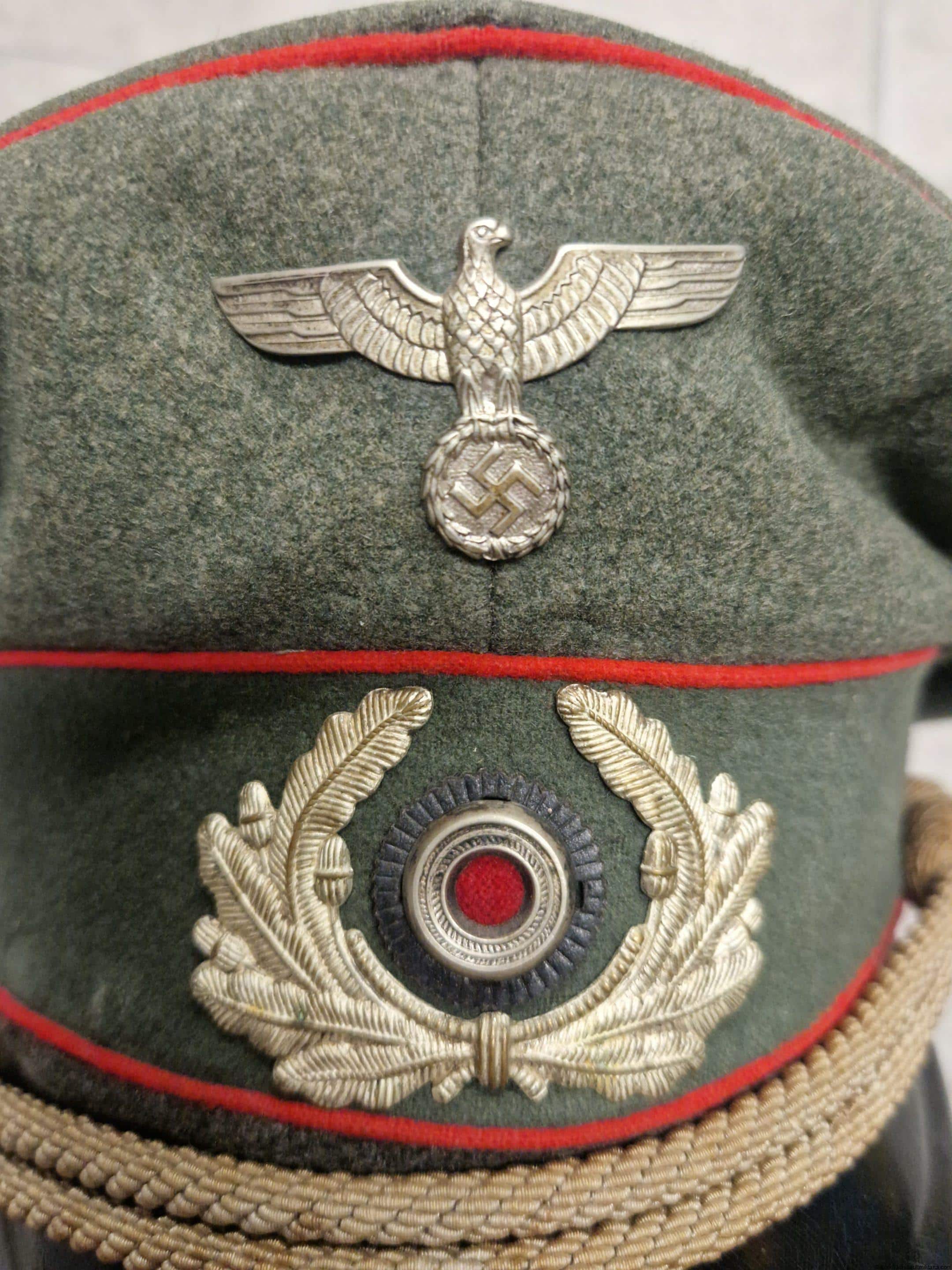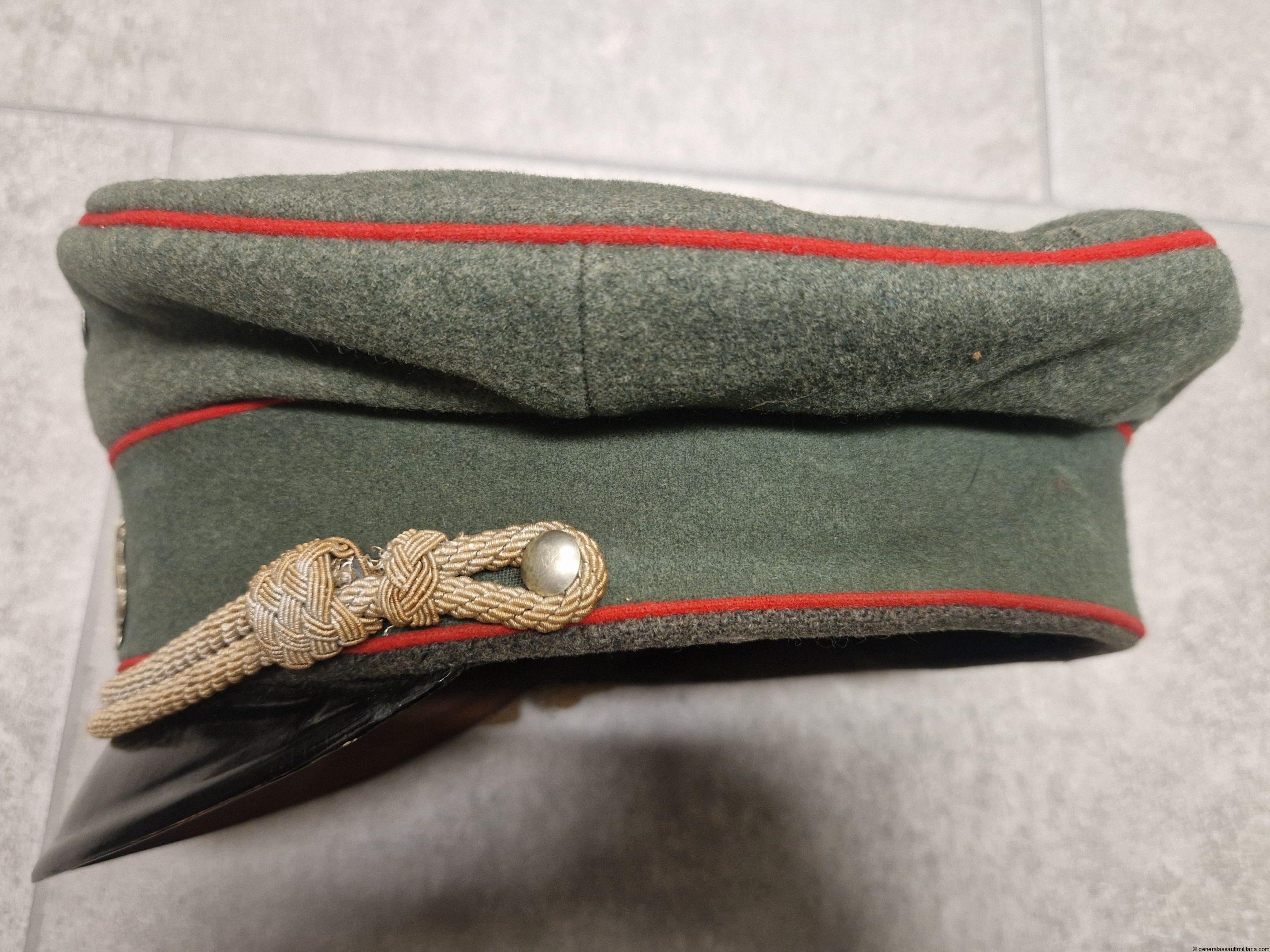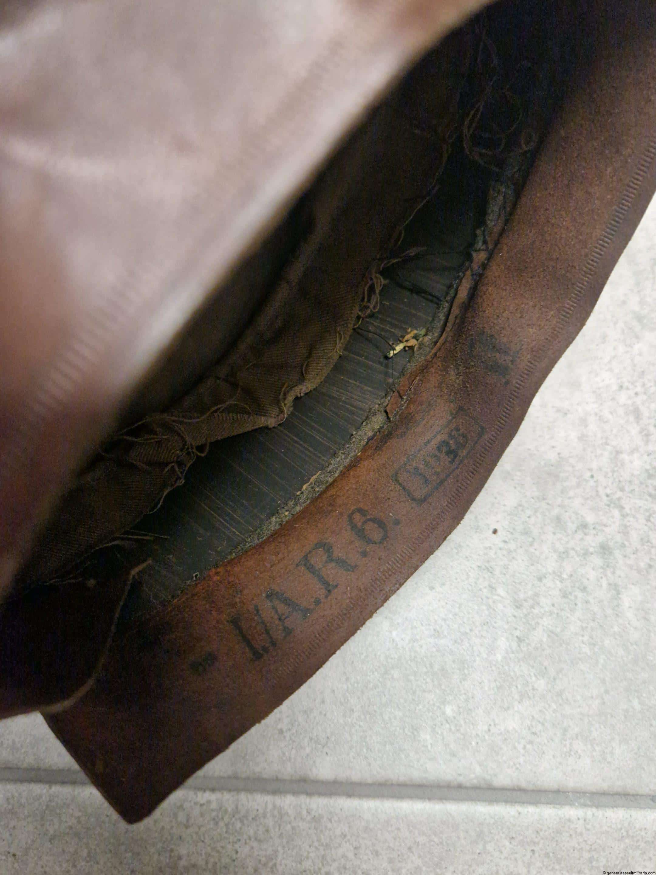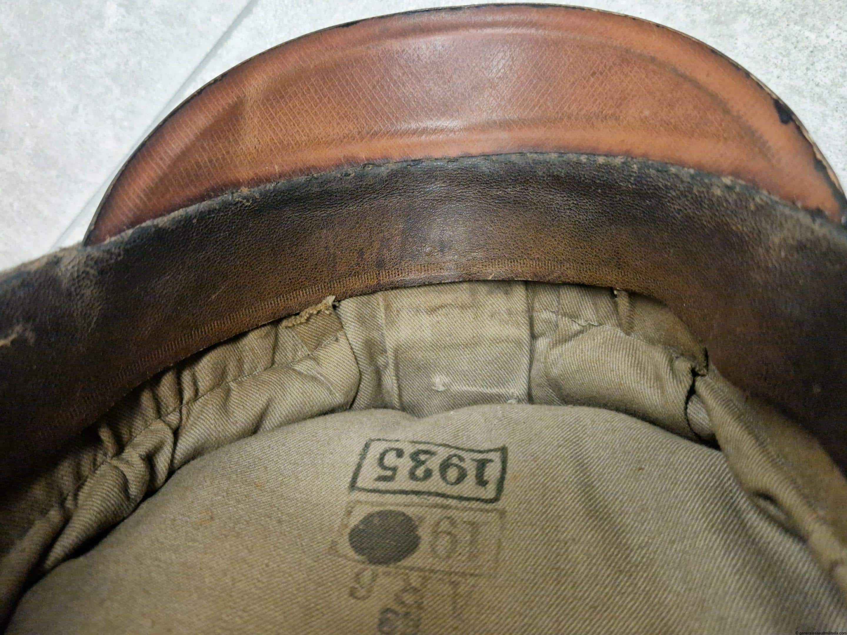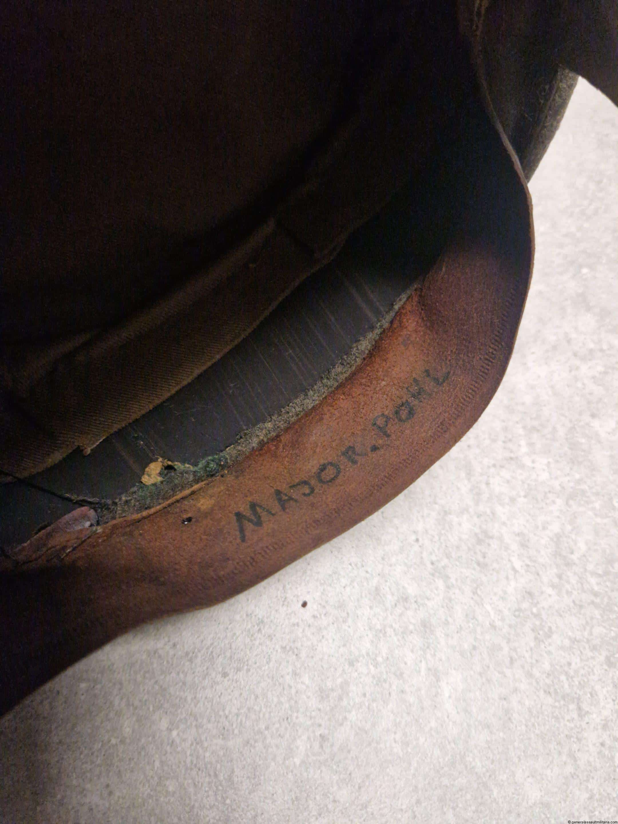 Reichswehr model artillery visor cap – Named Major Pohl. Very early Reichswehr period/model Third Reich visor cap with I./A.R.6 stamp on the inside and named to Major Pohl. Shows the first model insignia in excellent condition and still originally applied. Overall the cap remains in very good condition with good wear but very little damage from wearing, with only slight moth damage to the front green band. The sweatband and lining remain nicely sewn in and easily bendable. A few year and unit stamps are present on the inside. Rare cap!