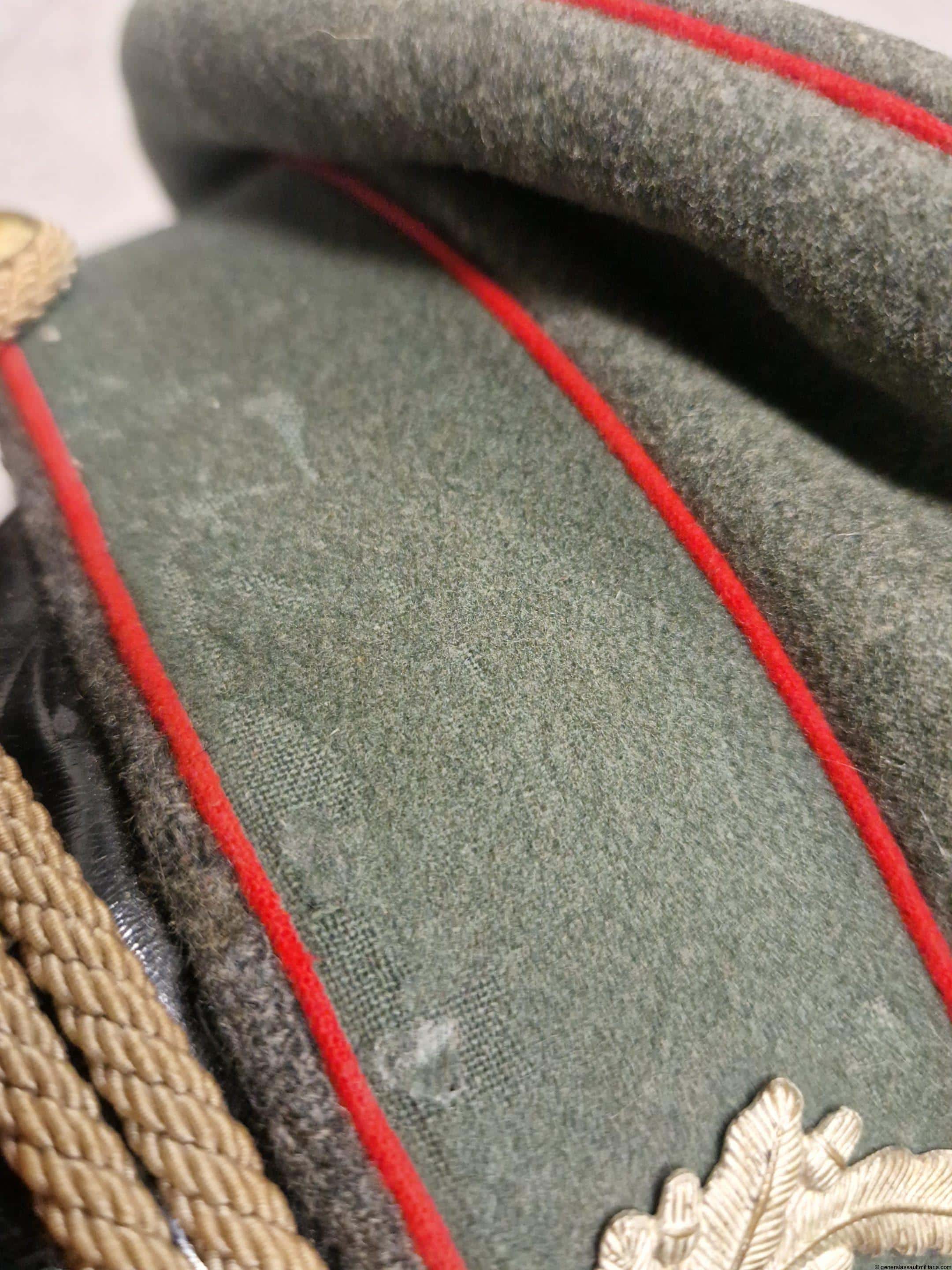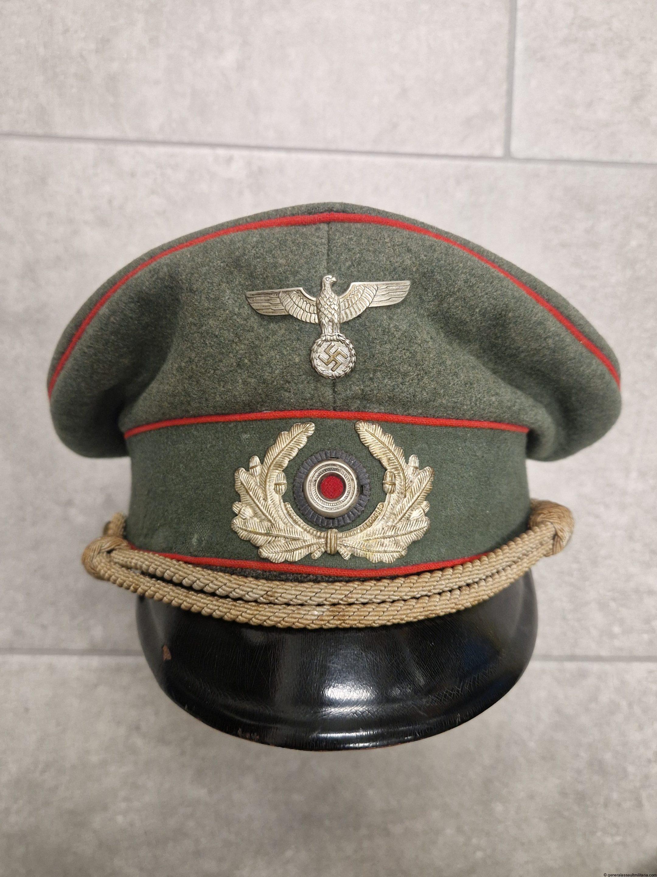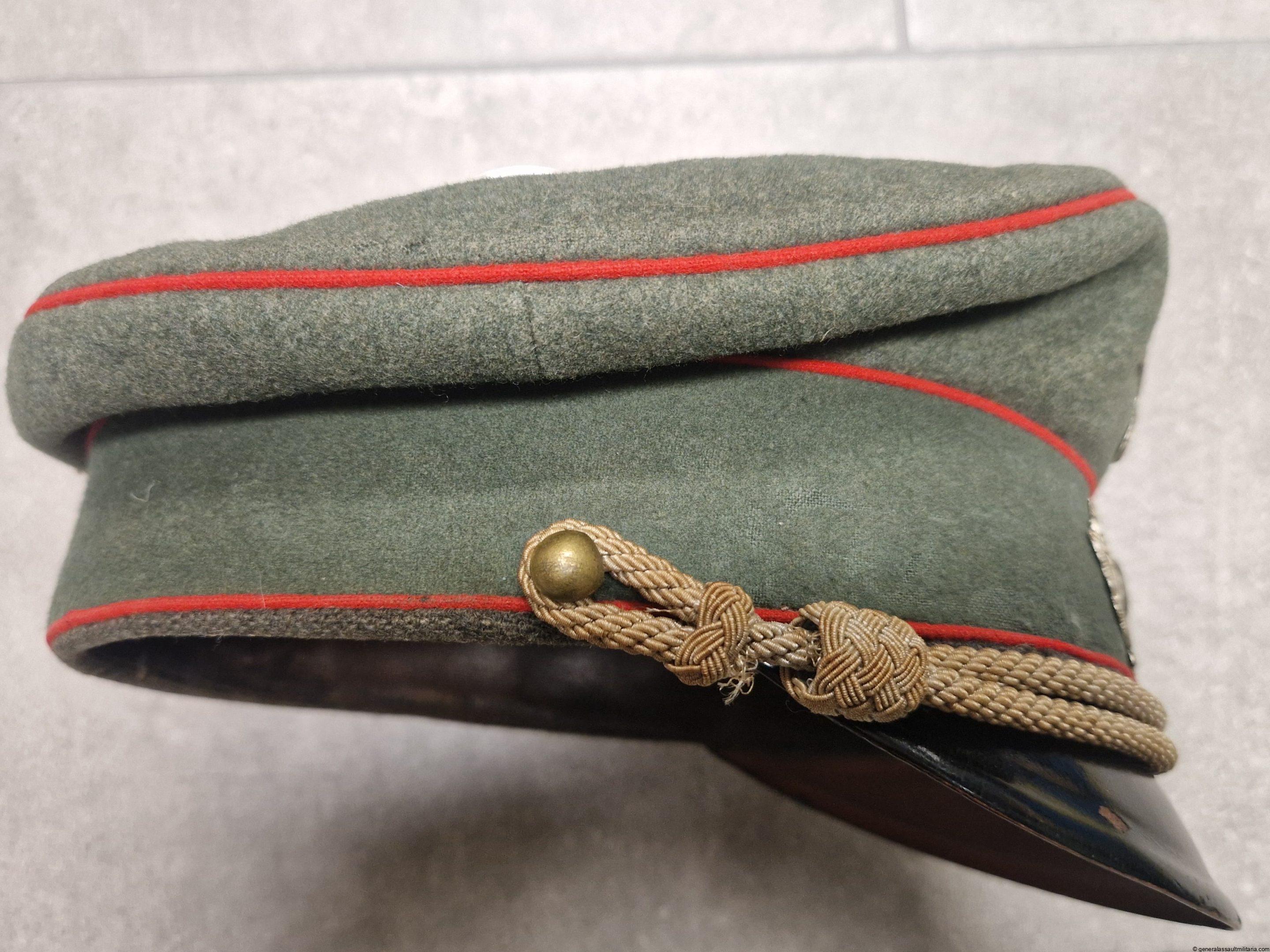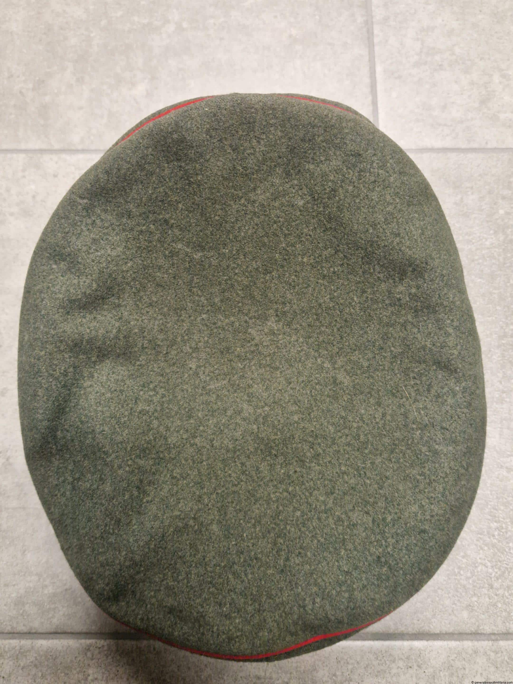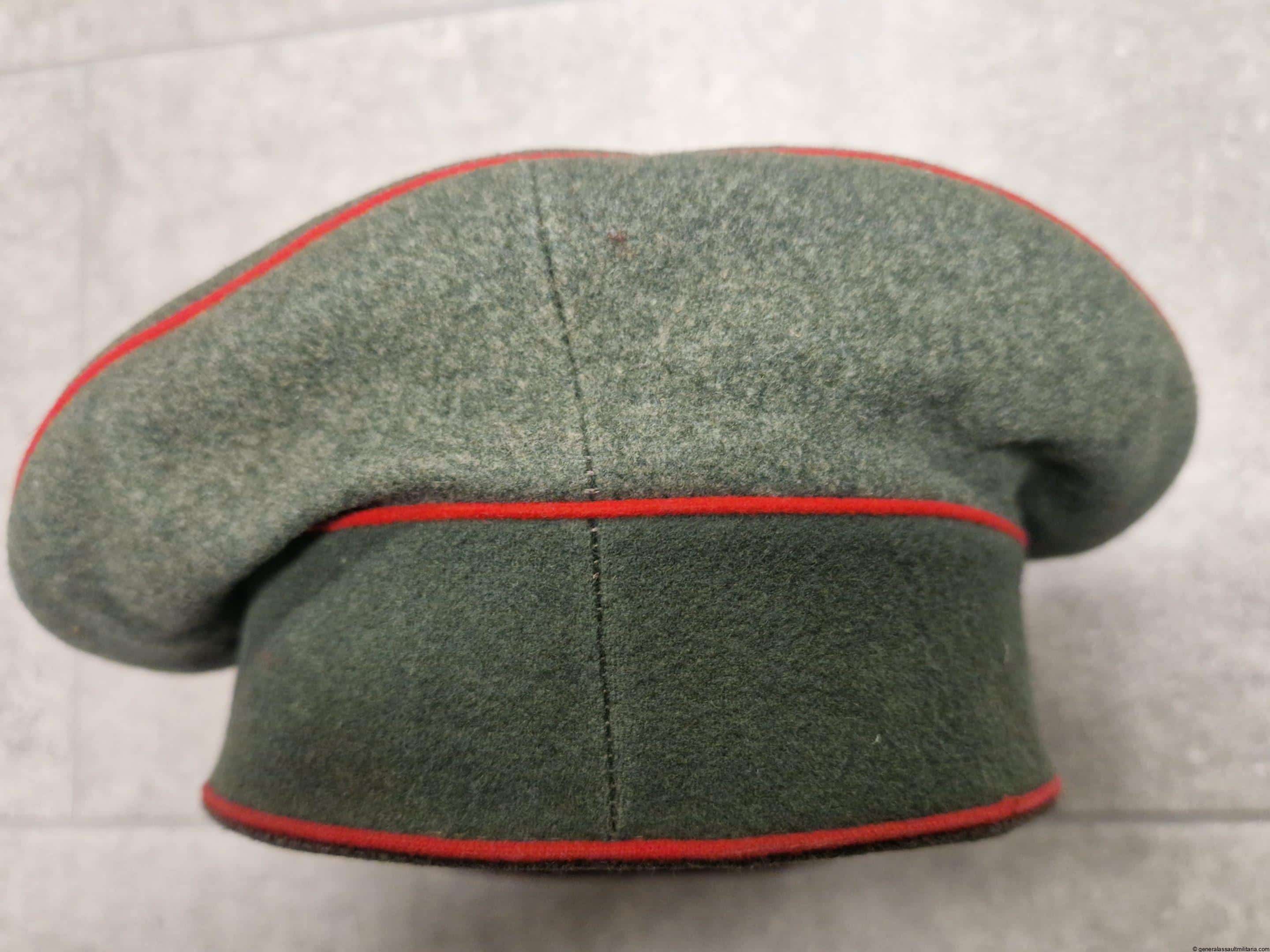 Reichswehr model artillery visor cap – Named Major Pohl. Very early Reichswehr period/model Third Reich visor cap with I./A.R.6 stamp on the inside and named to Major Pohl. Shows the first model insignia in excellent condition and still originally applied. Overall the cap remains in very good condition with good wear but very little damage from wearing, with only slight moth damage to the front green band. The sweatband and lining remain nicely sewn in and easily bendable. A few year and unit stamps are present on the inside. Rare cap!