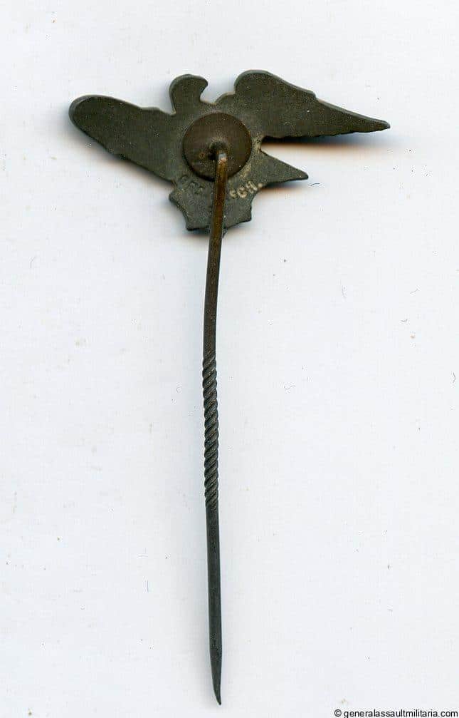 RLB stickpin – Hermann Aurich, Dresden. Mid to late war zinc stickpin with Reichsluftschutz eagle and Aurich makers mark. Very good condition with no finish and still full black factory painted swastika.