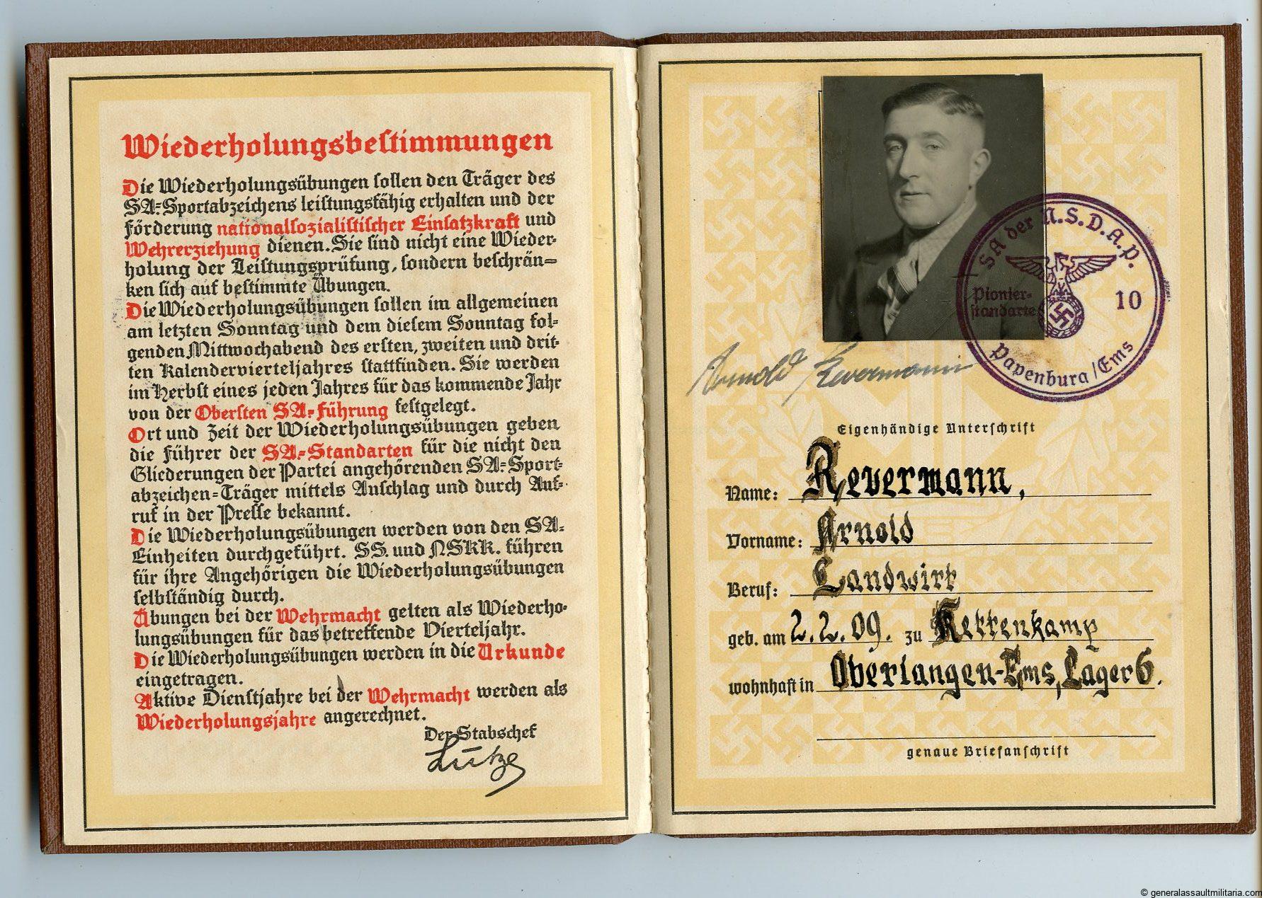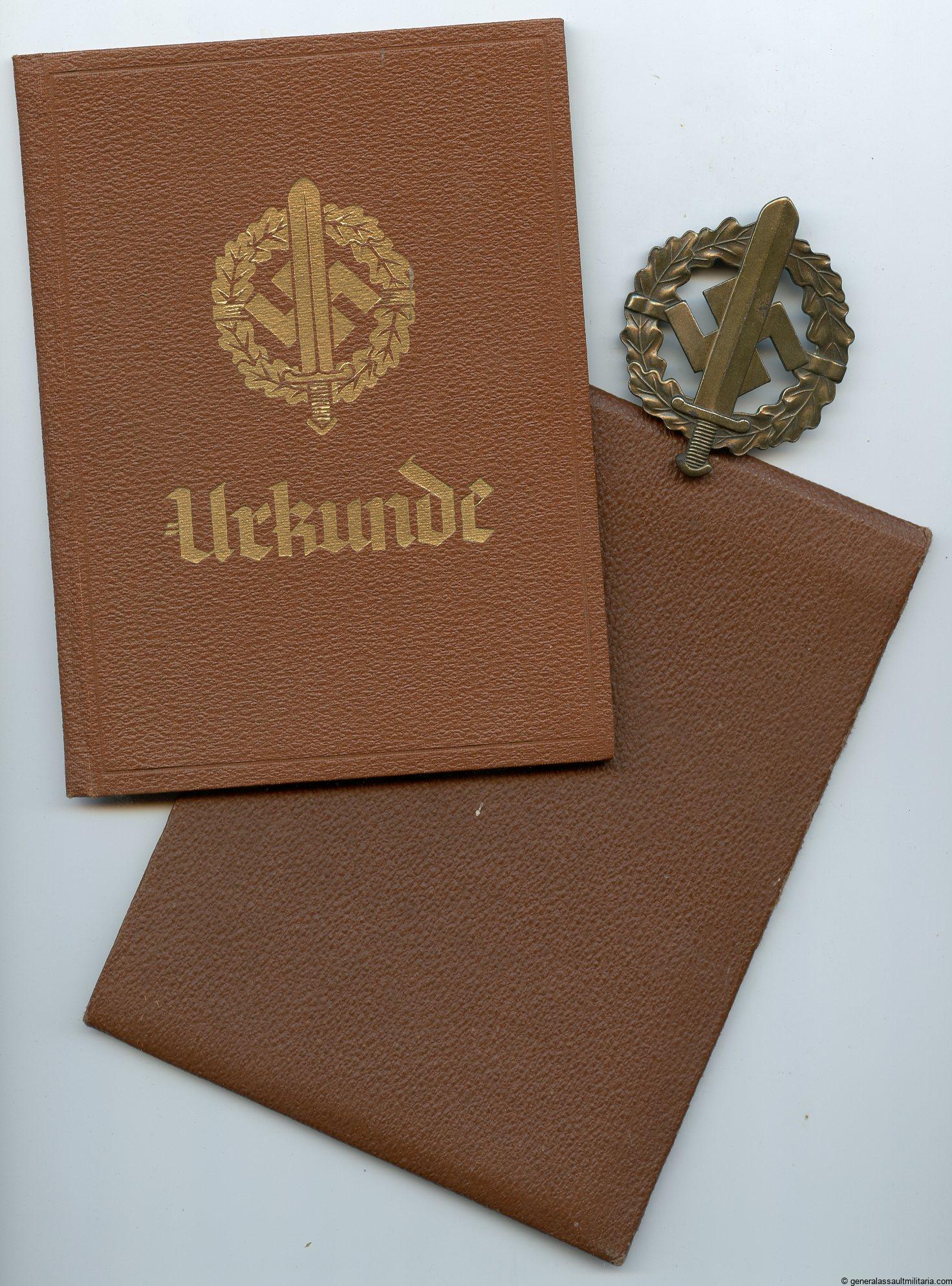 SA sport badge with award booklet and cover. The SA badge remains in unworn condition with a small spot on the sword but overall excellent condition. The SA booklet is still in mint condition and has the original cover present. Nice bronze set with filled in award certificate.