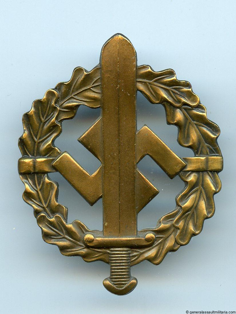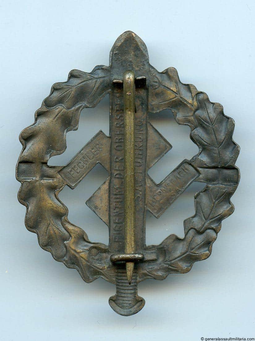 SA sports badge in bronze – Fechler, Bernsbach. Steel production SA sports badge with Fechler mark on the back and bronze finish with protective lacquer. Remains in mint condition with a all the finish still on the badge and a perfectly preserved finish on the front. Killer example!