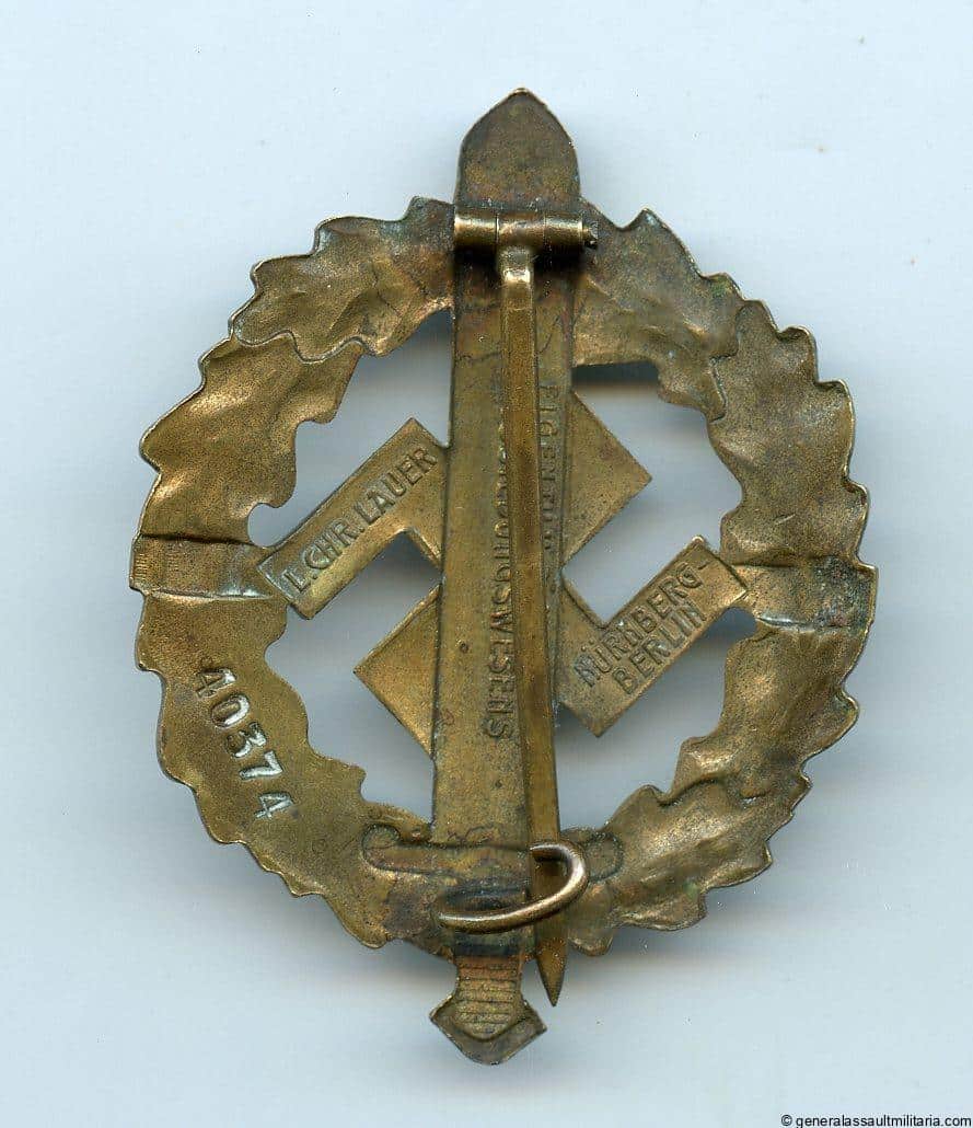 SA Sports badge in bronze – L. Lauer, Nürnberg. Early pre war tombac construction with directly soldered catch and Lauer maker mark, numbered with a fairly low number 40374. Remains in good worn condition with good finish remaining.