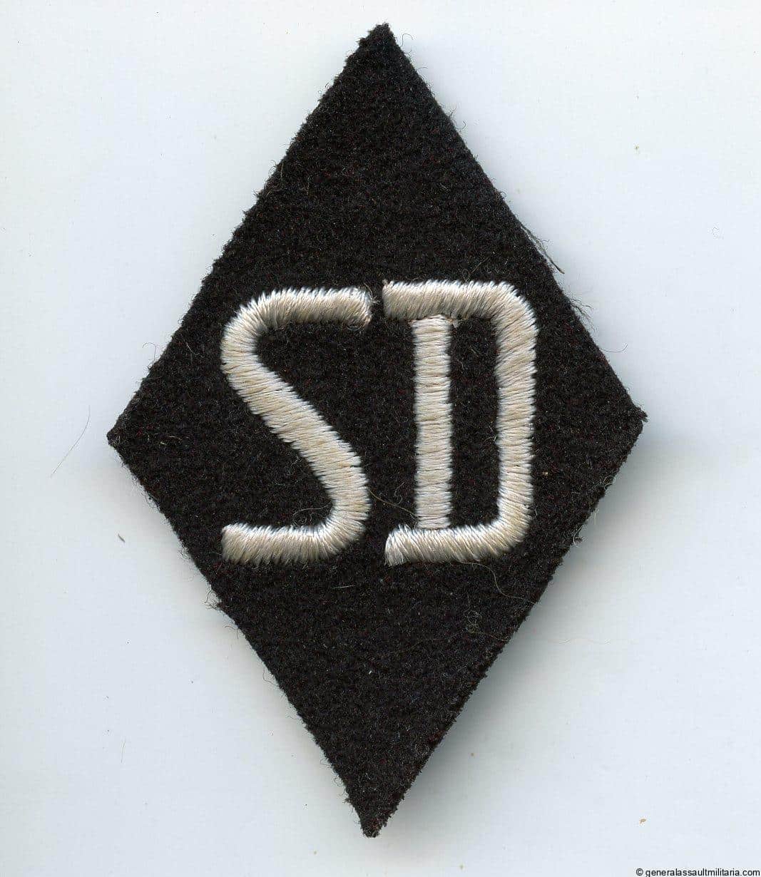 SD ‘Sicherheitsdienst’ sleeve diamond. Black wool base with machine woven SD. Dachau produced cloth insignia that was worn ont he green/grey SD uniform. Remains in mint unworn condition and was never used.
