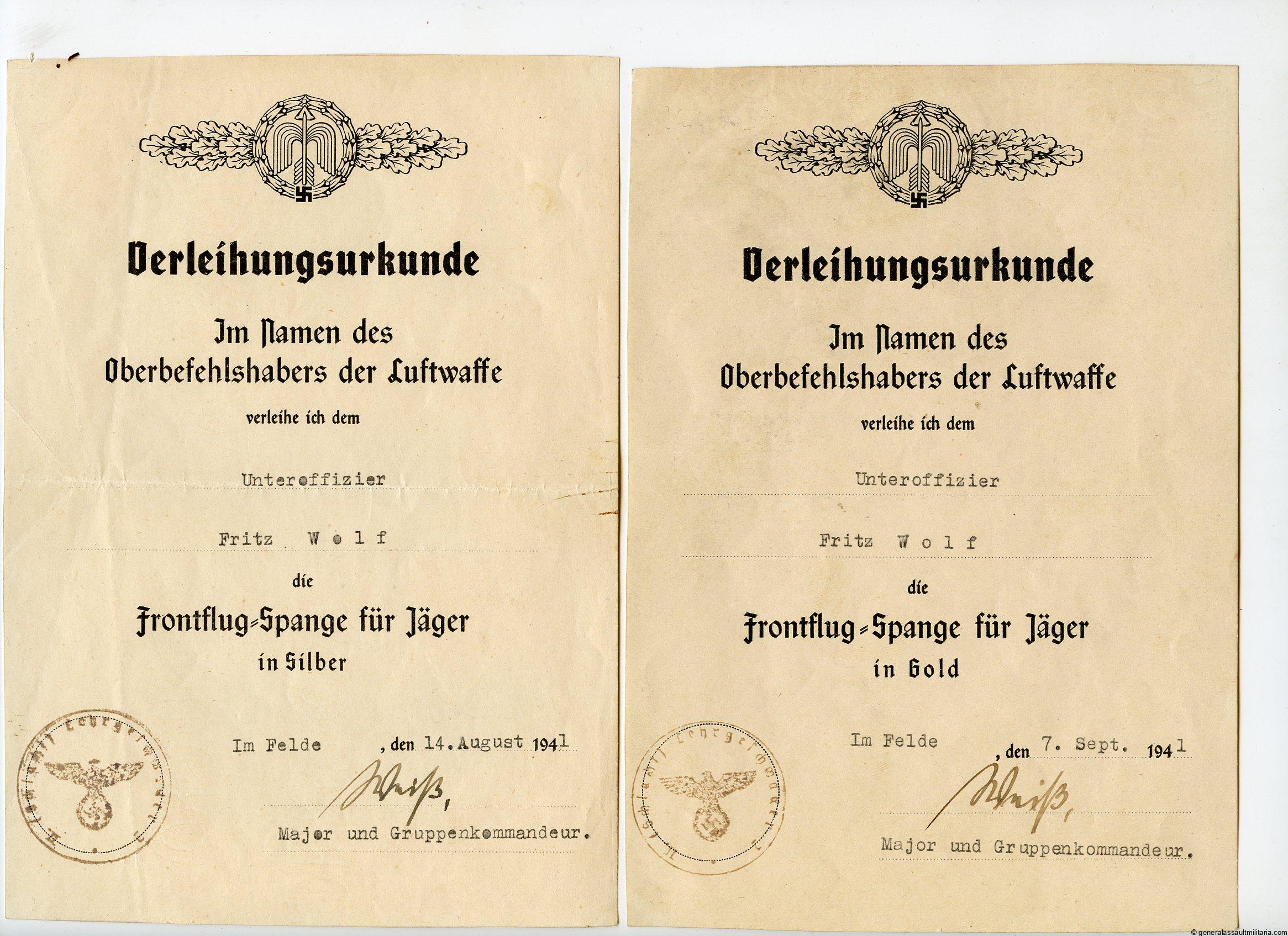 Small 3 document group to fighter pilot Fritz Wolf II Schlacht lehrgeschwader 2. Interesting set of 3 fighter clasps or Frontflugspange für Jäger to a pilot that flew the BF109. Both the silver and gold documents are slightly cut on the sides and are clearly been displayed with light fading of the ink. The Bronze clasp document remains in excellent condition. Also present is a photo of his 109 with his name on the reverse and lots of text. Very difficult to find fighter set.