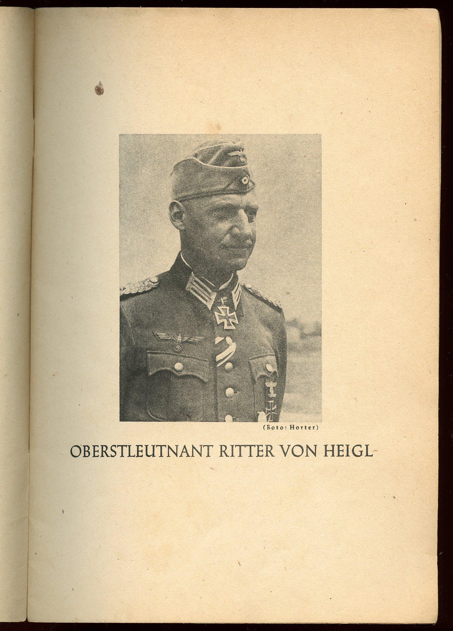 Small army knights cross booklet – Ritter von Heigl. Small green 40 page booklet on Heer knights cross winner Oberstleutnant ritter von Heigl. Lots of information about his actions, early life and battles. Great information on a specific KC winner fitted in a propaganda booklet. Remains in good condition with average signs of use to the corners.