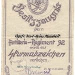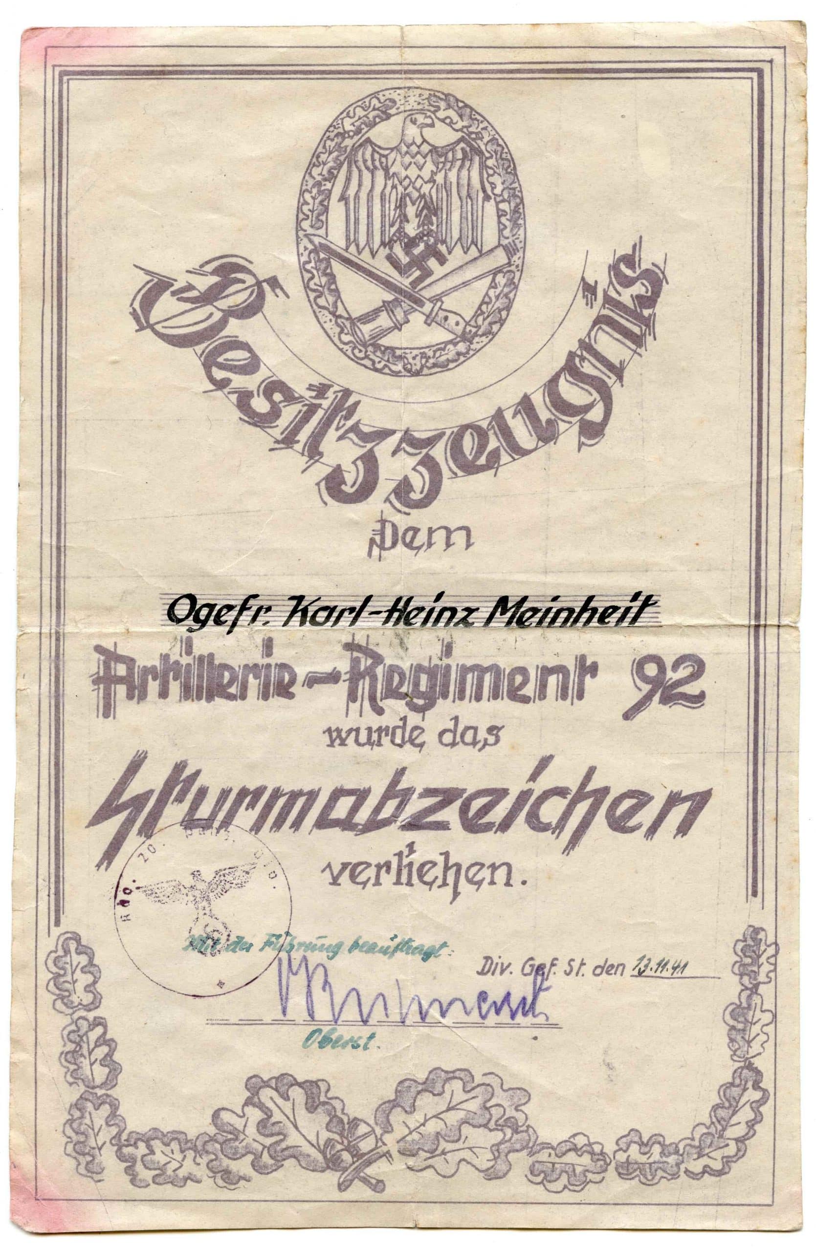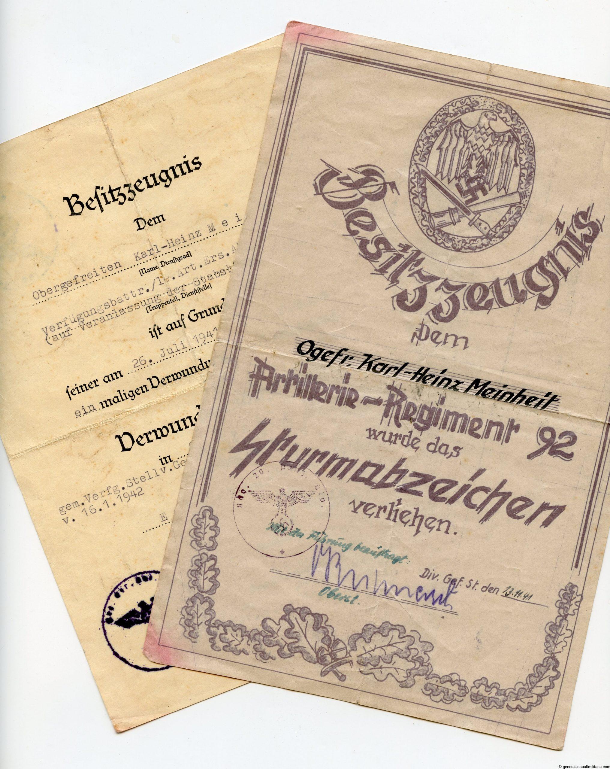 Small award document set to Obergefreiter Karl-Heinz Meinheit Artillerie regiment 92. Consists of Meinheit his 1941 awarded wound badge document in lightly stained and vaulted condition.