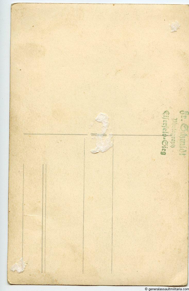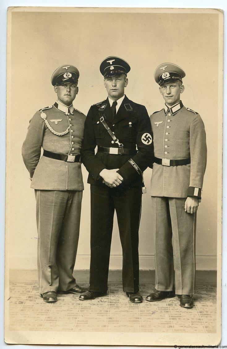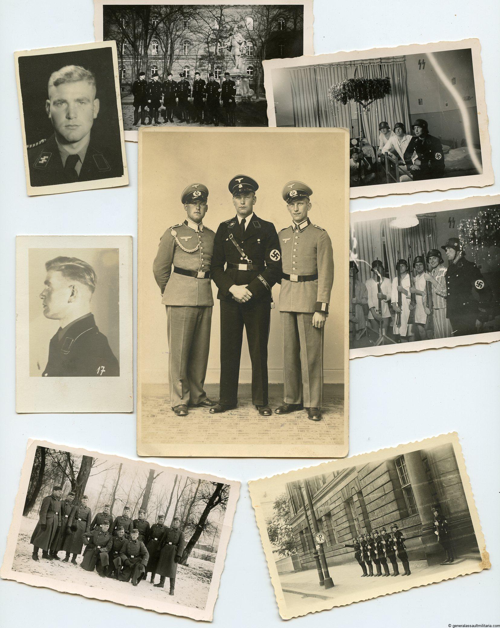 Small SS photo lot of an Adolf Hitler SS-Mann. consists of one large postcard size portrait with the SS member between two Wehrmacht soldiers, 5x 6x9cm photos with lots of black uniforms and A.H. cufftitles in wear, two small ID photos normally encountered on the SS ID or on the SS-Fragenbogen(application).