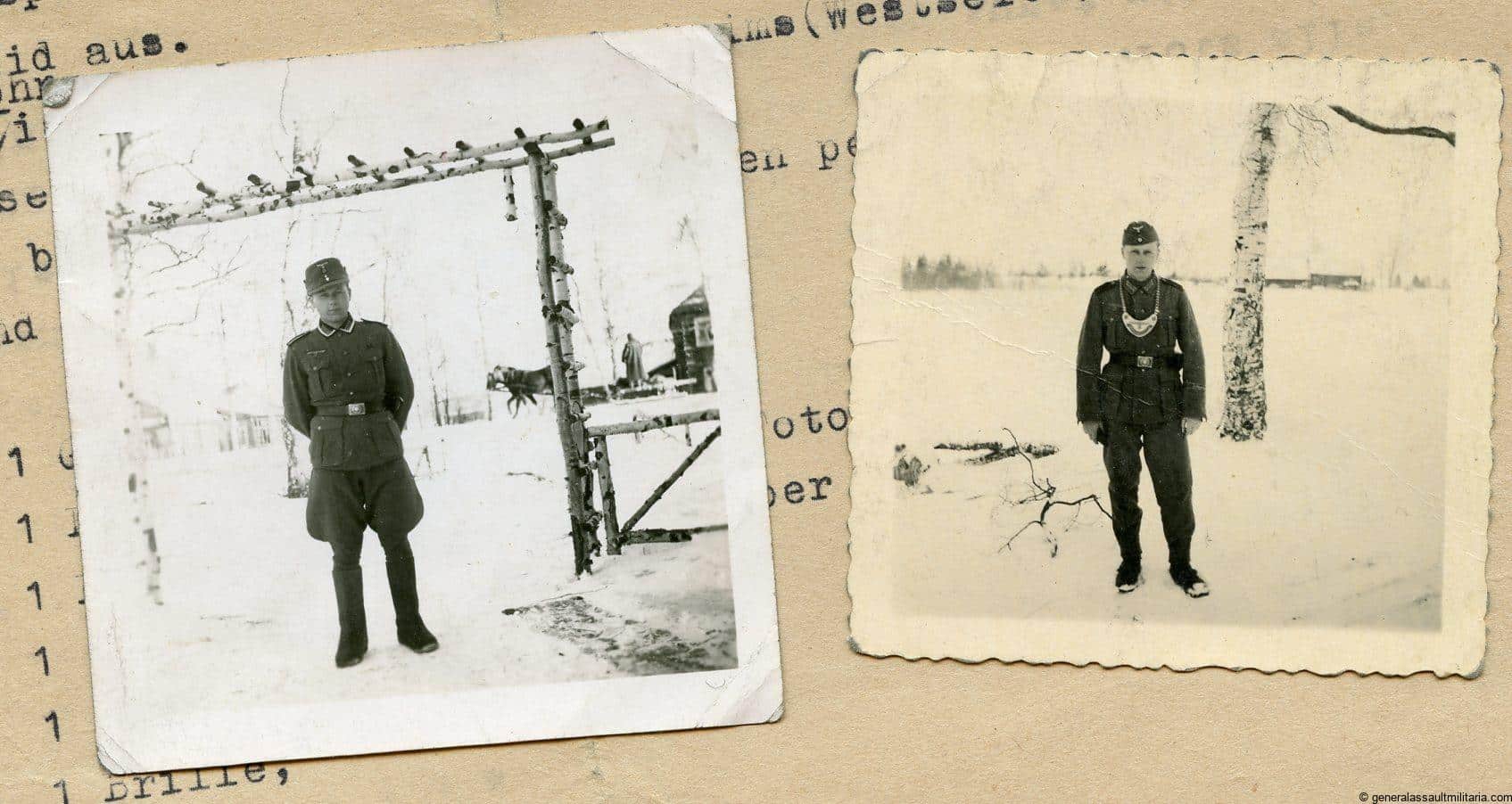 Small lot with Feldgendarmerie portrait. Consists of 2 letters about the death of of a soldier and one document signing up to the army from another family member. Comes with two winter photo 6x9cm. One showing the Feldgendarmerie gorget and cufftitle in wear.